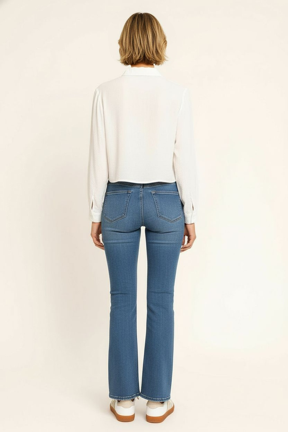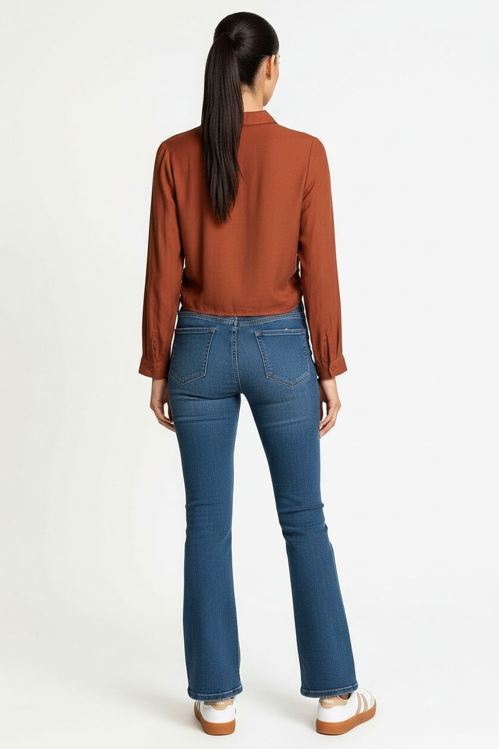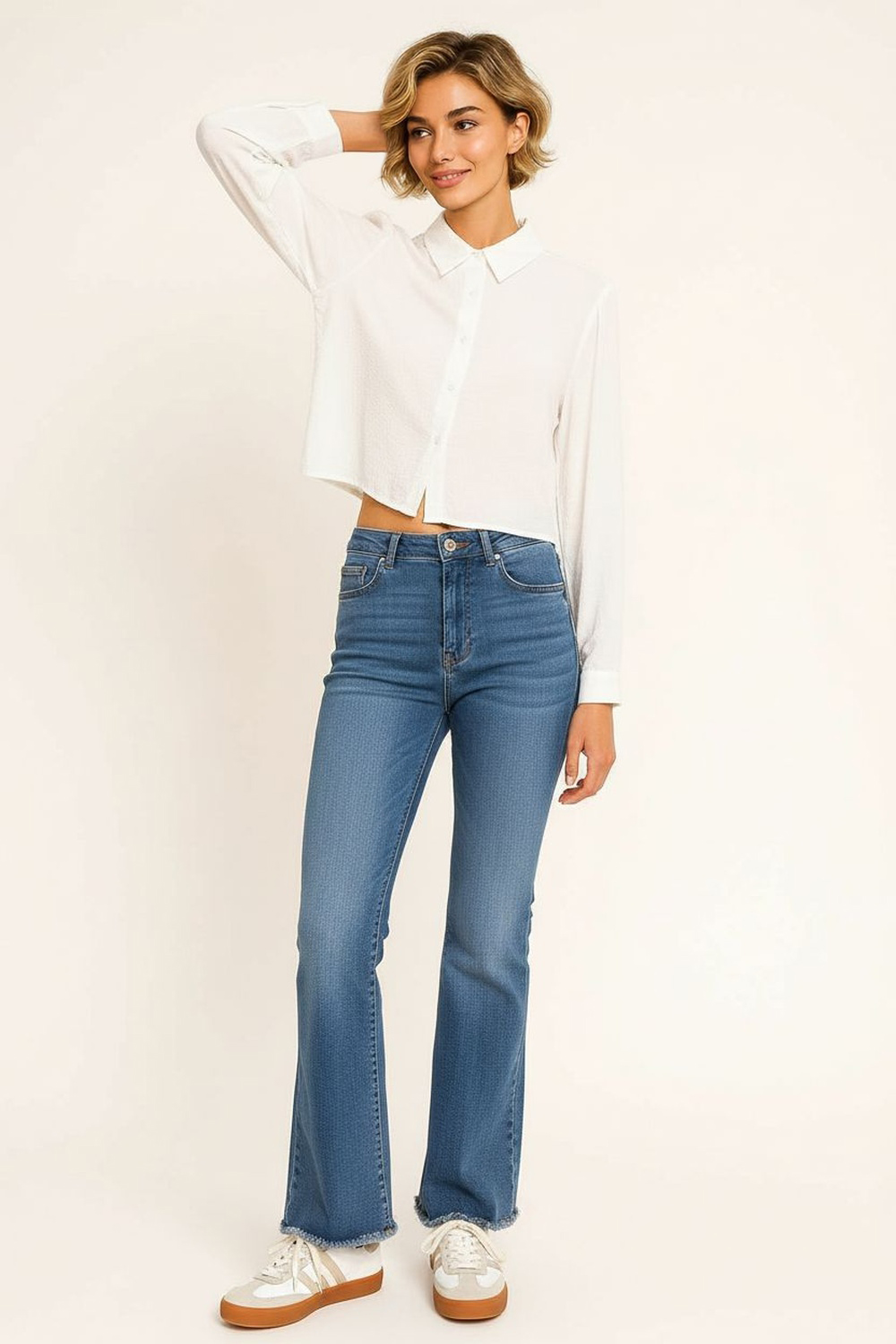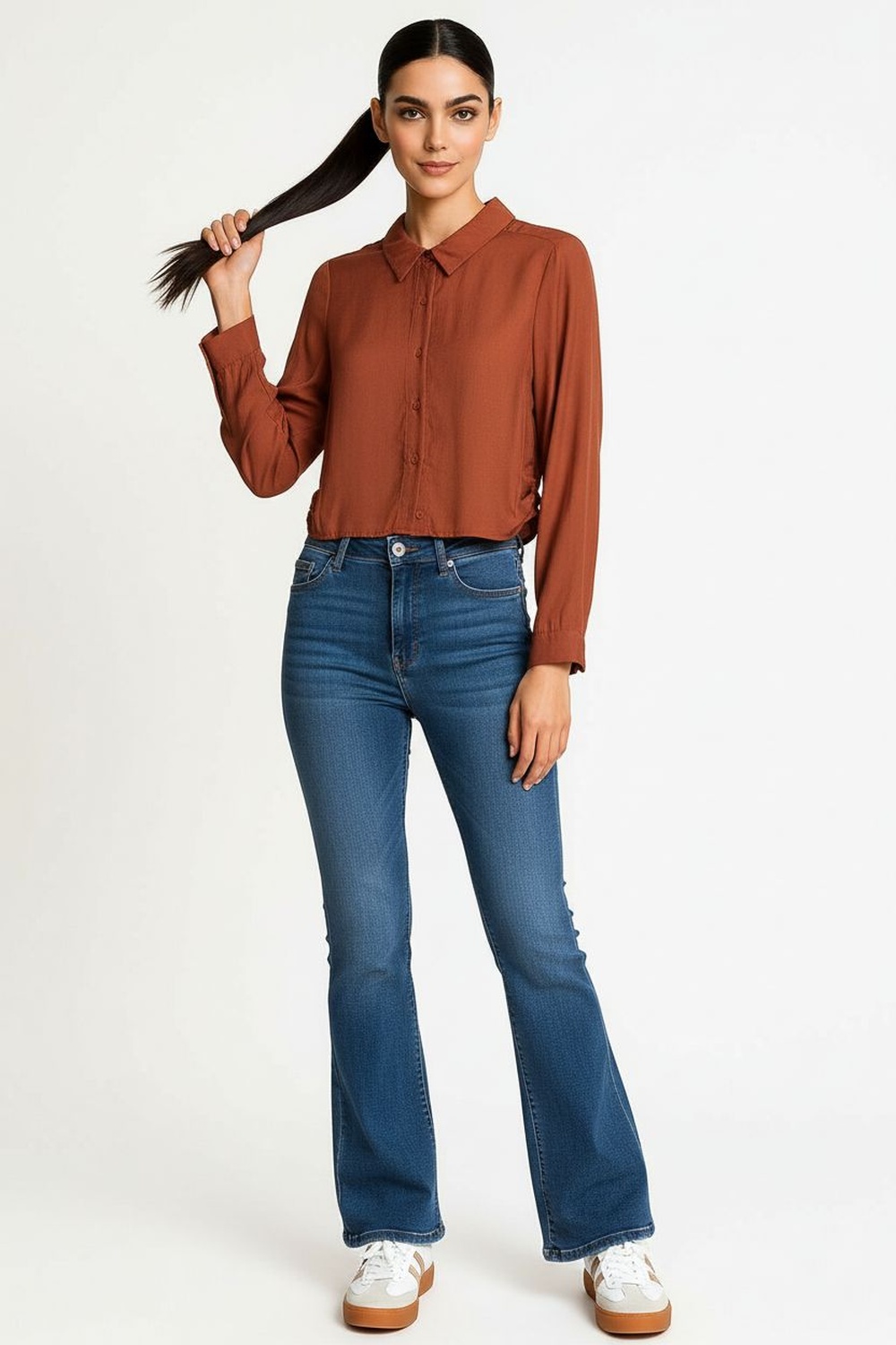 Blusa de manga larga con cuello camisero estructurado, confeccionada en tejido suave tipo wool peach que ofrece una textura aterciopelada al tacto, diseño corto con botones frontales que aportan un toque moderno, puños ajustados que brindan un acabado pulido y elegante, costuras reforzadas que garantizan confort y durabilidad