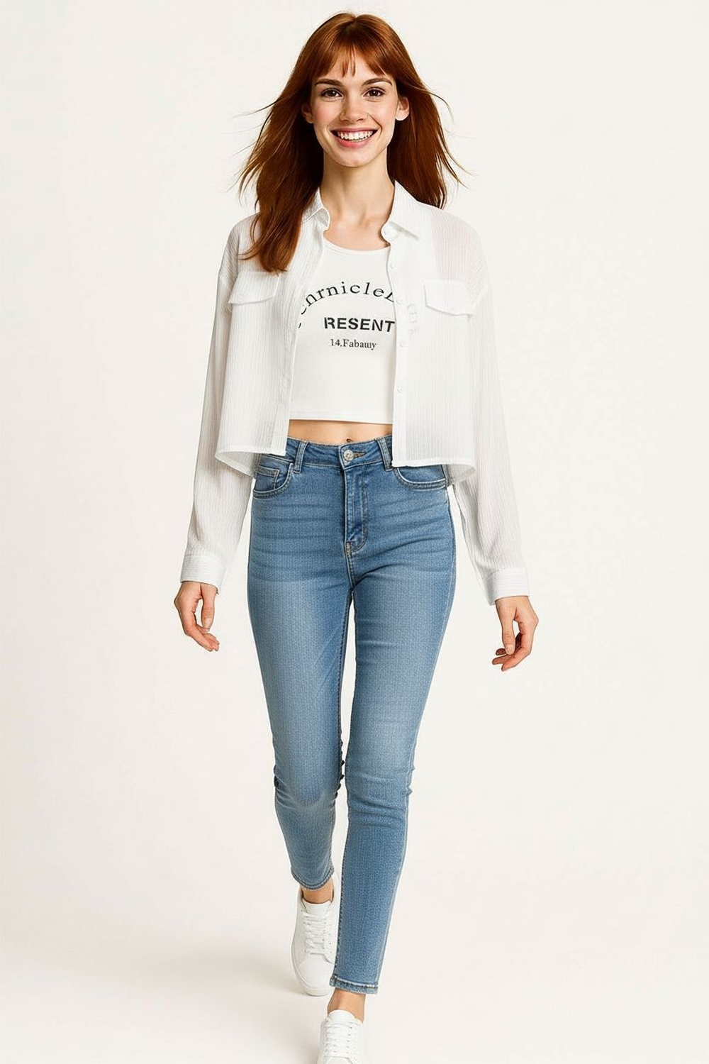 Blusa crop con tirantes delgados y escote en V pronunciado que estiliza el cuello, tejido texturizado con forro interno en zona frontal que brinda mayor seguridad, corte amplio con caída ligera y terminado ondulado en ruedo que aporta movimiento natural