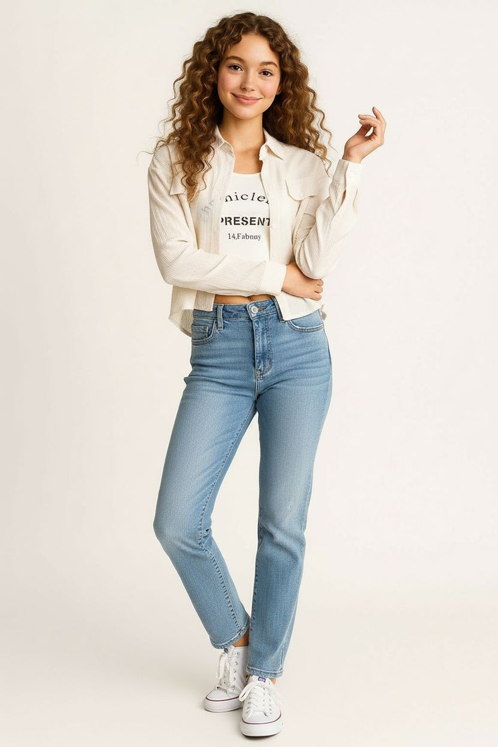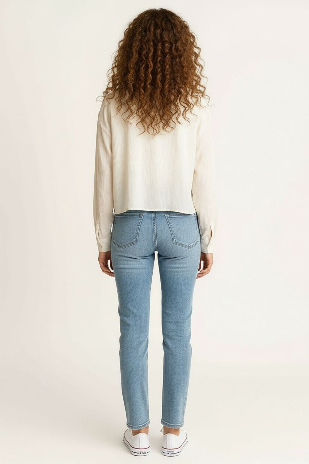 Blusa camisera de corte recto con largo a la cintura, manga larga con puño y botón funcional, cuello clásico estructurado que aporta presencia, botonadura frontal completa para ajuste práctico, detalle de charretera en hombros que eleva el diseño, confección en tela ligera de tacto suave que brinda comodidad y caída natural