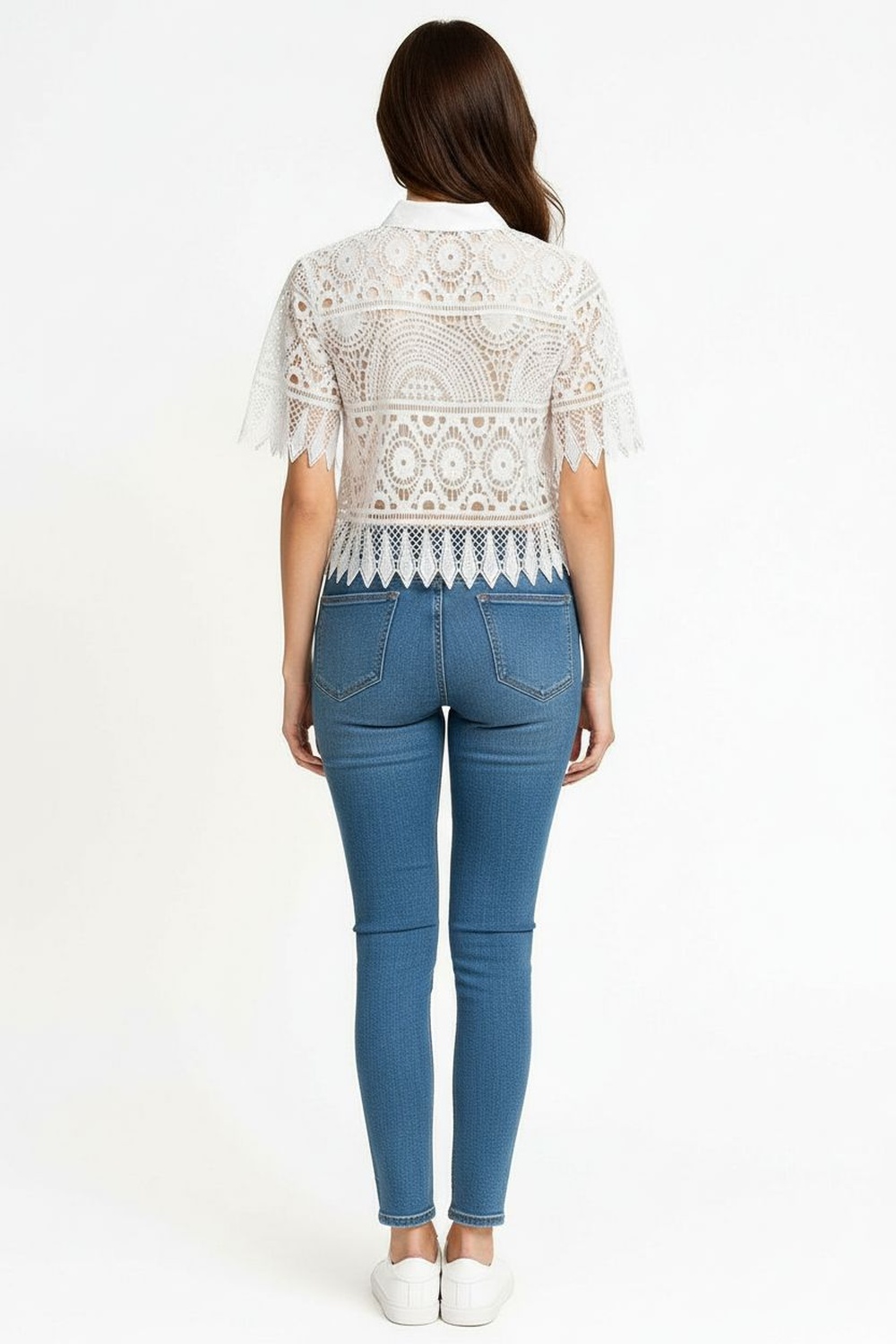 Blusa camisera con botonadura frontal completa, cuello camisero estructurado que mantiene su forma, diseño en tejido de encaje trabajado que aporta textura artesanal, mangas cortas con caída suave que ofrecen comodidad, bajo con terminación delicada que define el contorno