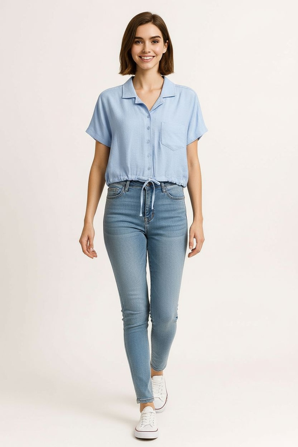 Blusa camisera manga corta, cuello con solapa, cierre frontal con botones, bolsillo de parche en pecho, bajo ajustable con jareta