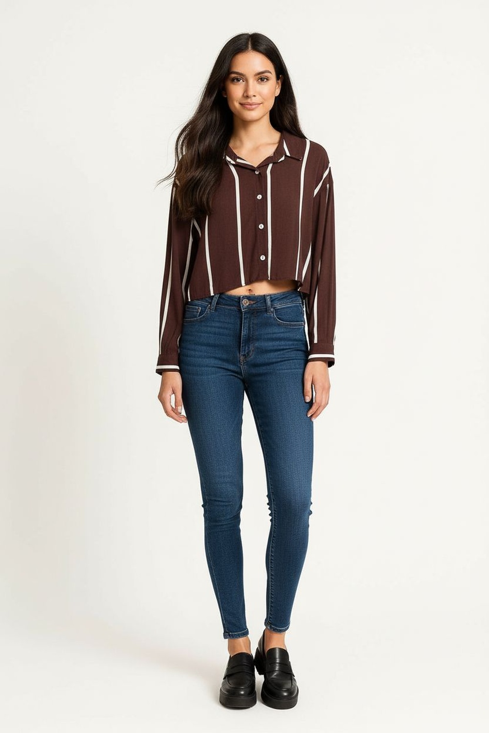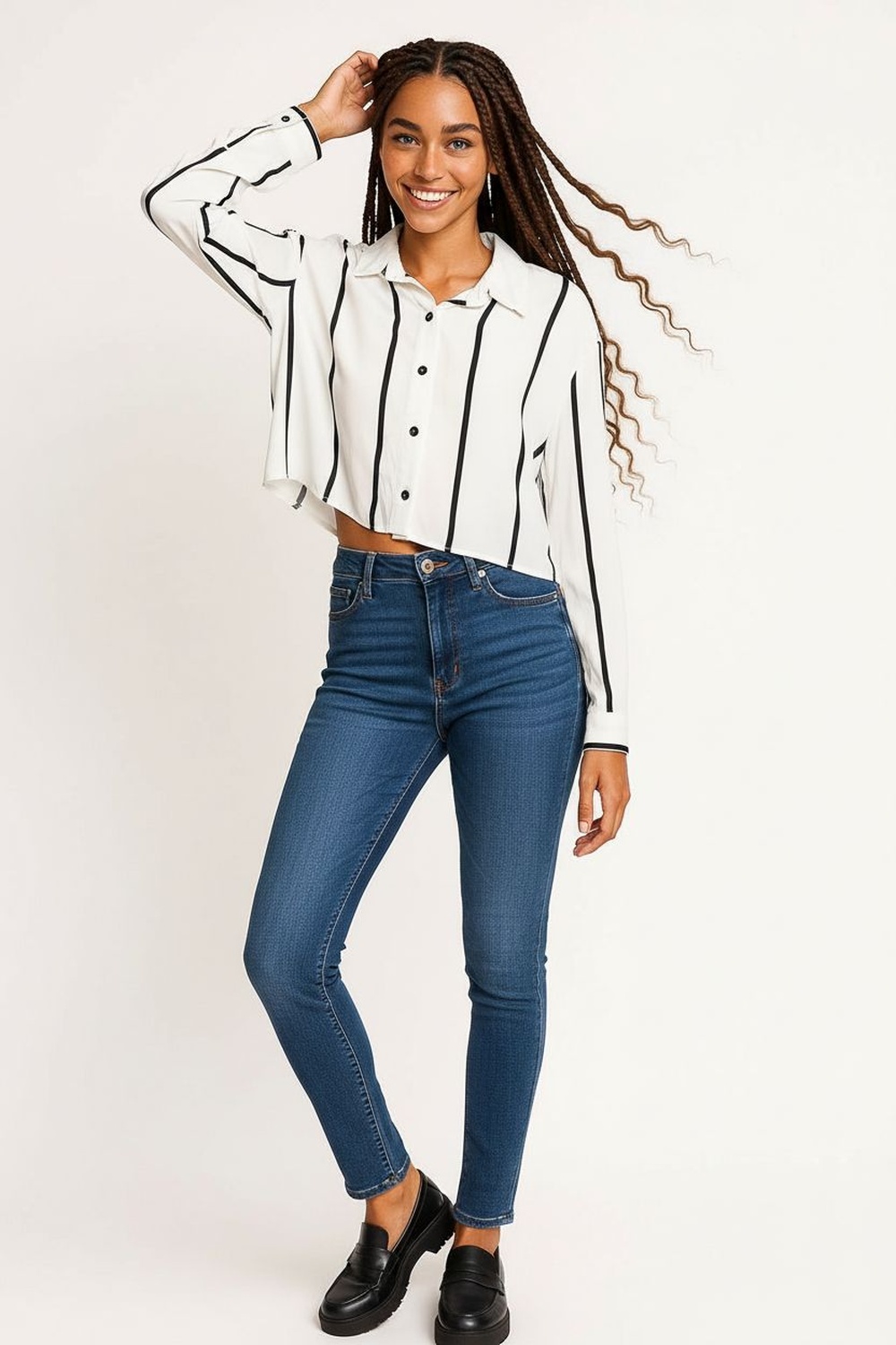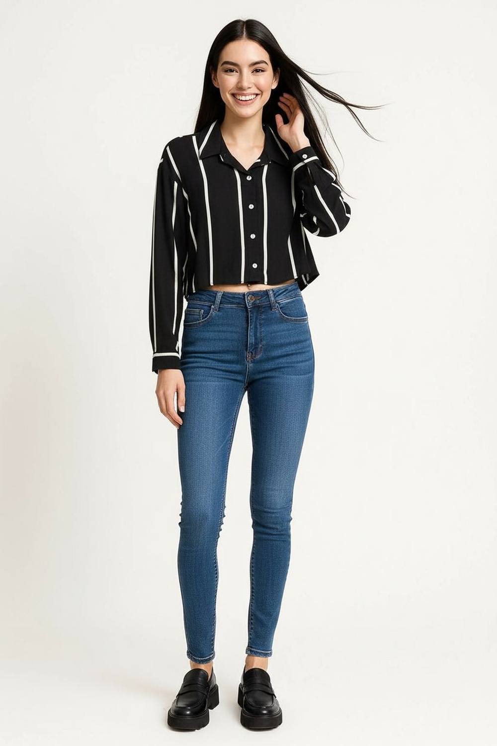 Blusa camisera de manga larga con botones al frente, cuello estructurado que brinda acabado pulido, corte corto que realza la figura, confección en tejido de caída suave que facilita movilidad