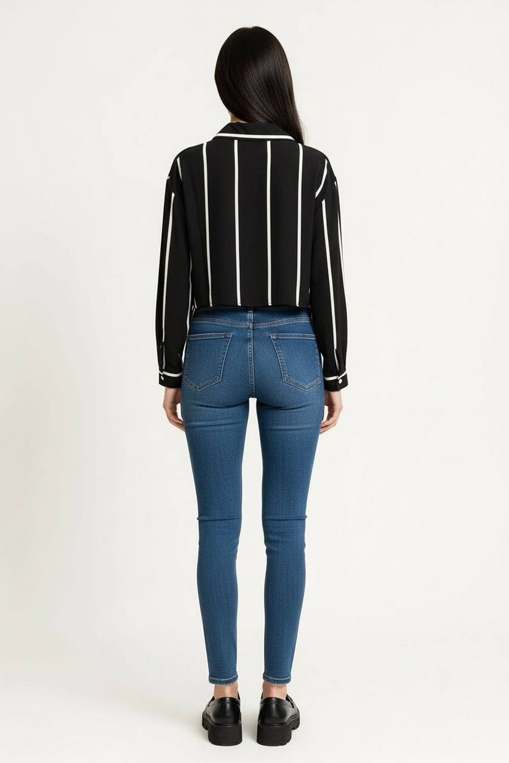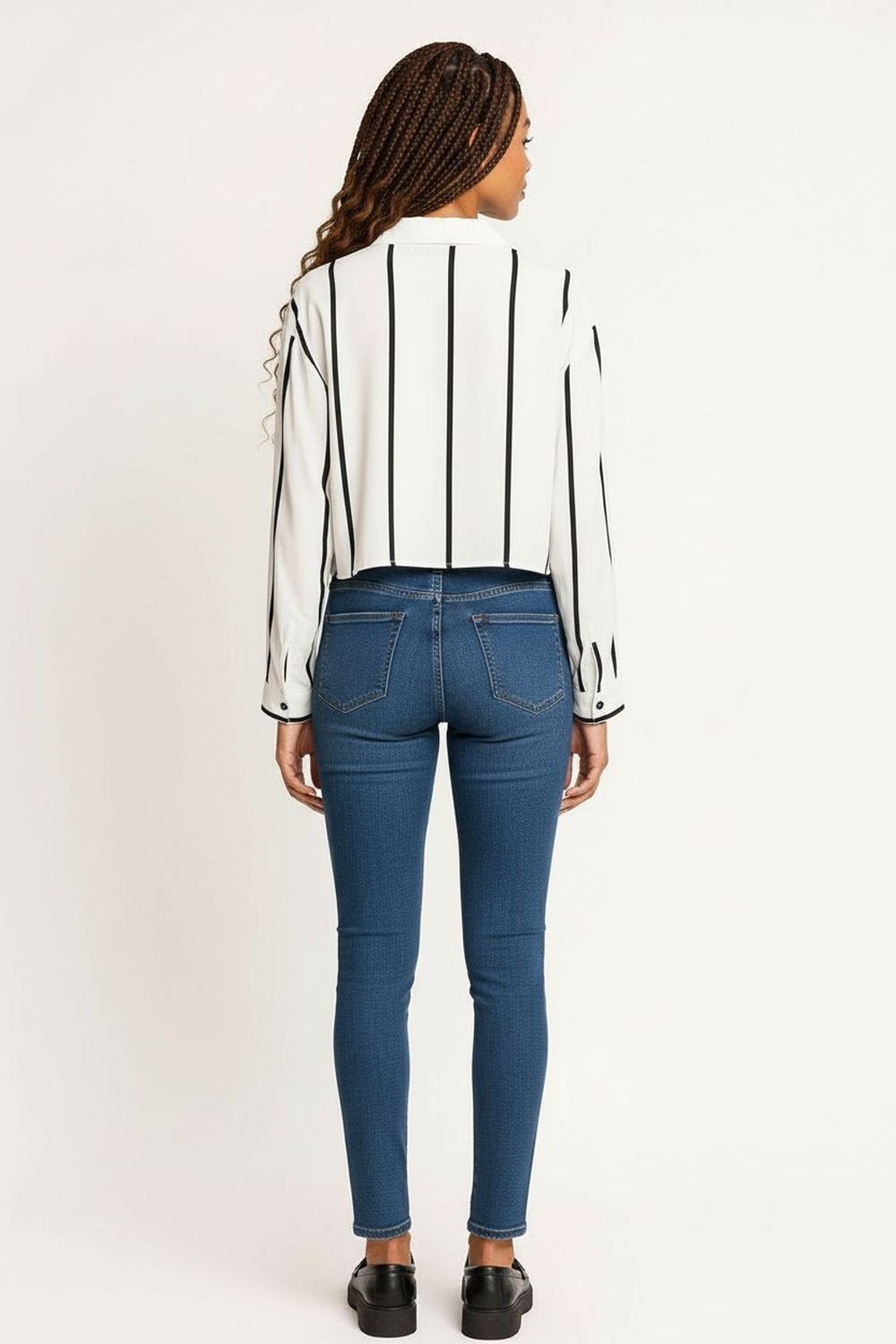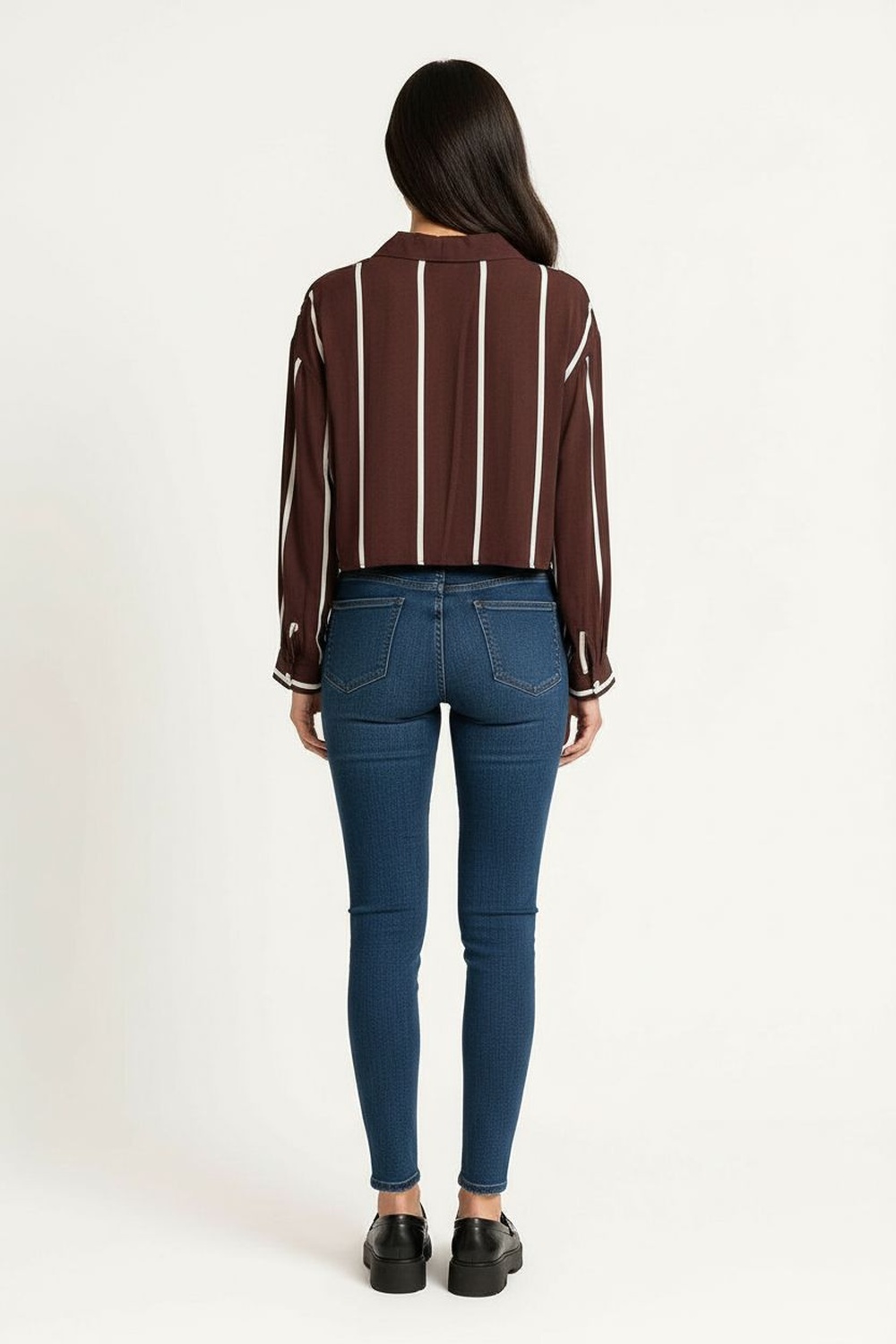 Blusa camisera de manga larga con botones al frente, cuello estructurado que brinda acabado pulido, corte corto que realza la figura, confección en tejido de caída suave que facilita movilidad