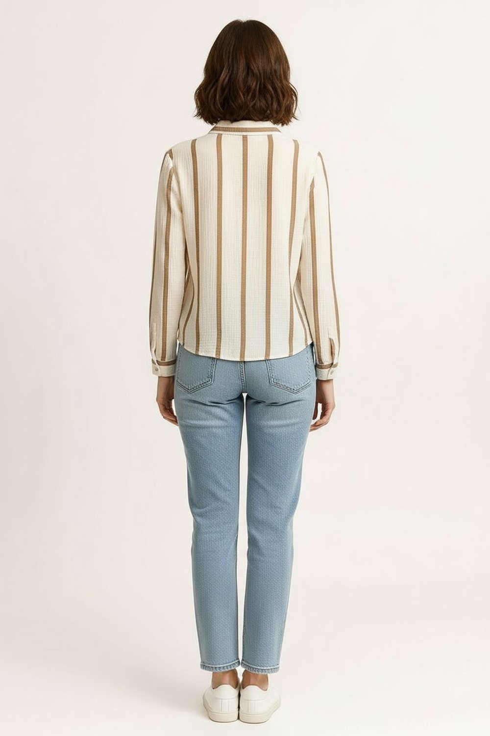 Blusa amplia diseño de rayas, cuello camisero con botones frontales y manga larga con botón en puño
