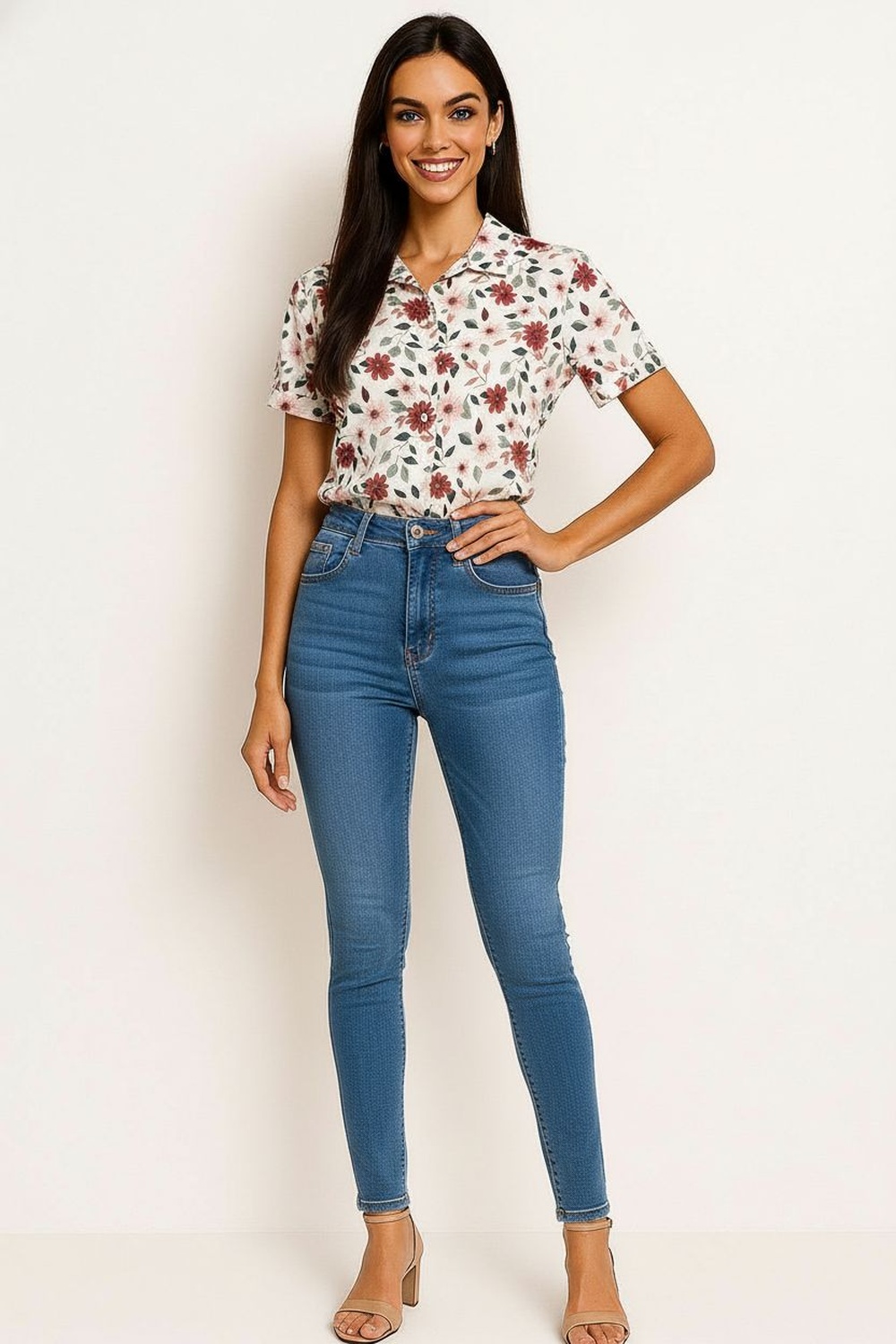 Blusa camisera de manga corta con cuello clásico, botonadura completa al frente, confección ligera con movimiento fluido, estructura recta que se adapta con comodidad, terminación inferior amplia que permite caída natural