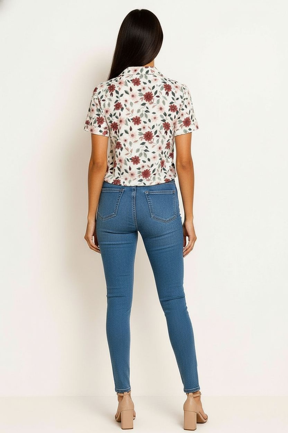 Jeans de tiro alto con estructura rígida que define la silueta, cinco bolsas funcionales que aportan practicidad, costuras visibles que refuerzan el diseño, corte recto que ofrece comodidad al caminar, confección en mezclilla resistente de larga durabilidad