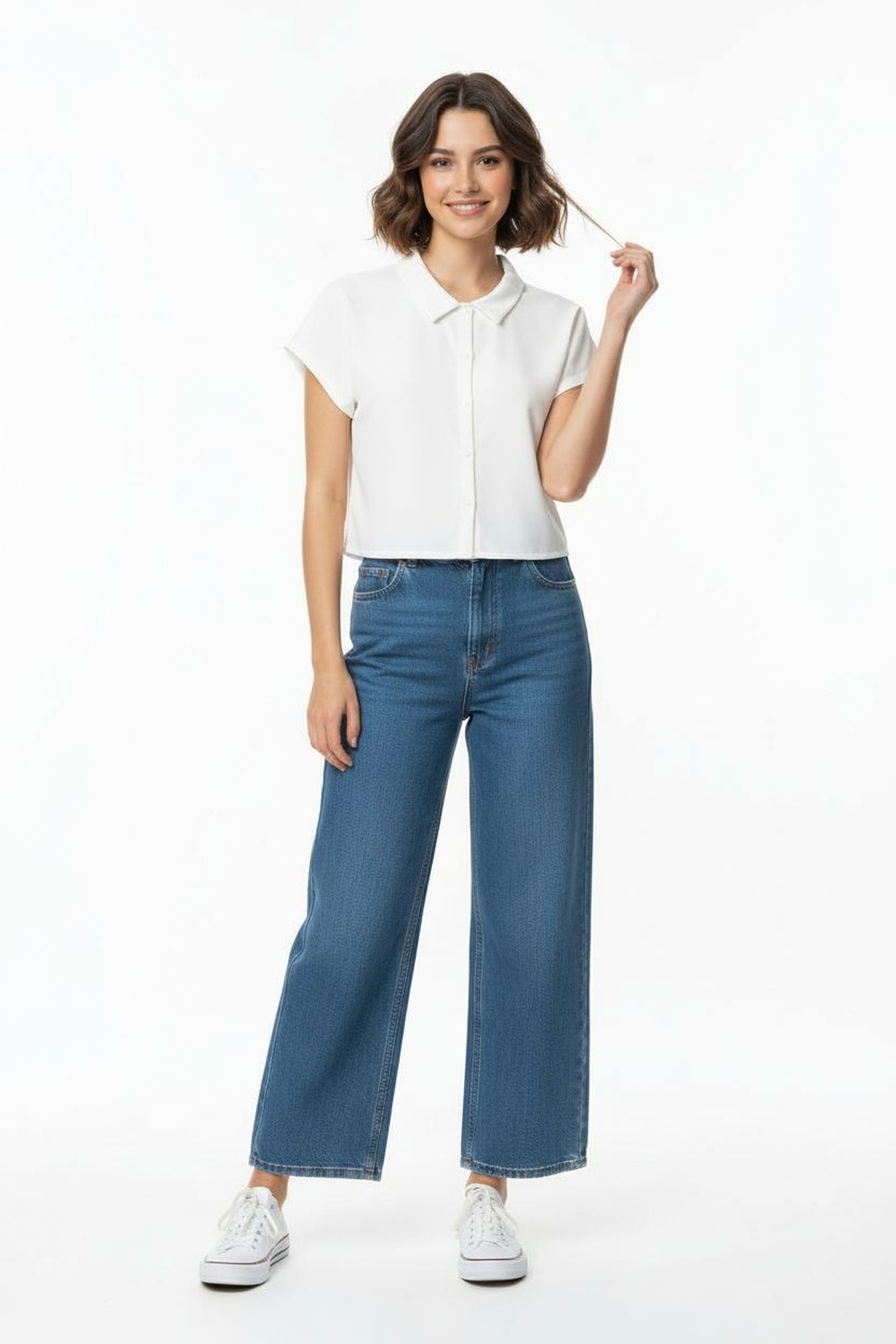 Blusa tipo camisera con cuello clásico, botonadura frontal, manga corta, corte ajustado, confección ligera, estructura suave