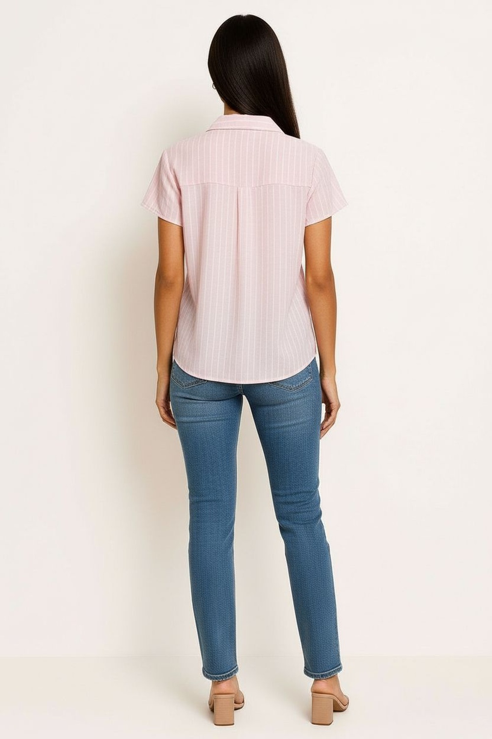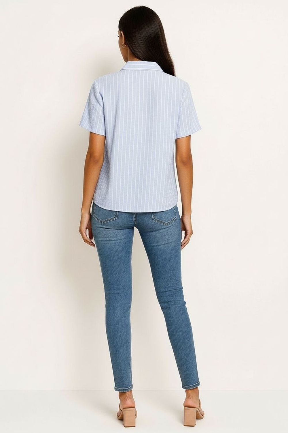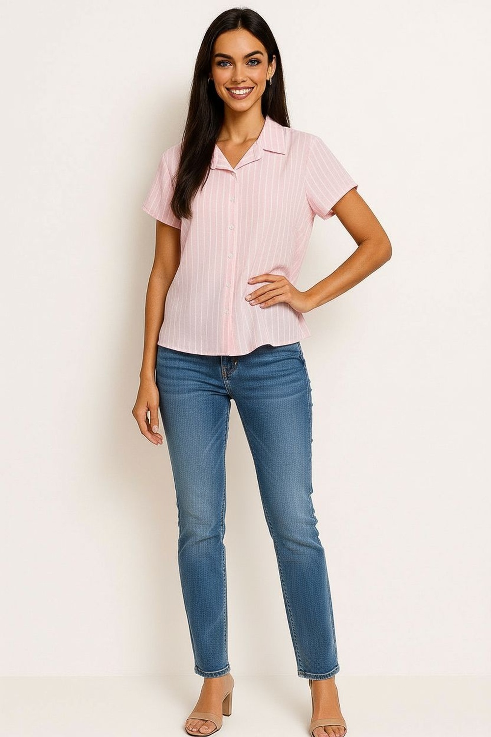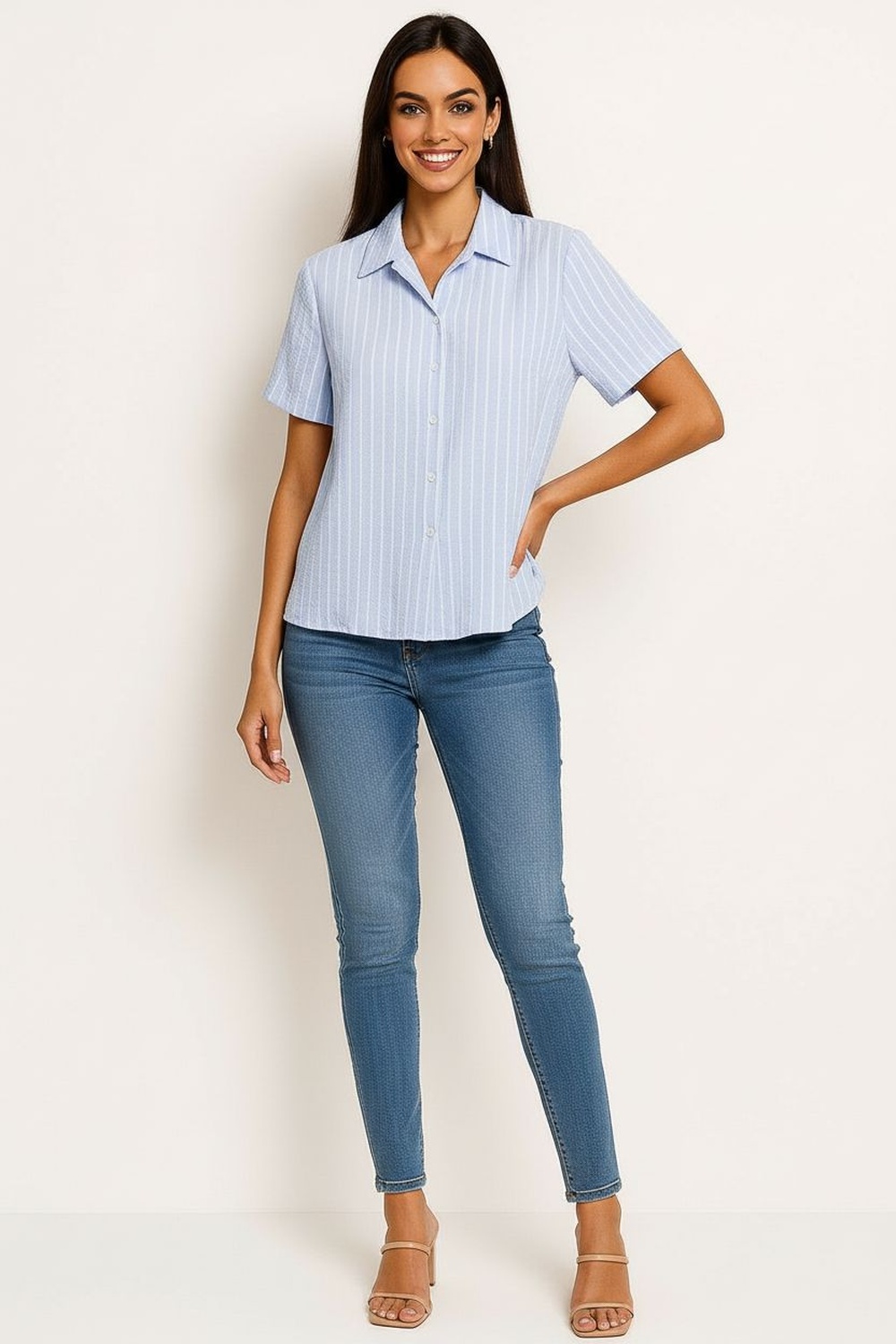 Blusa camisera con botonadura frontal, cuello clásico, manga corta, caída ligera, estructura cómoda, terminados limpios y funcionales