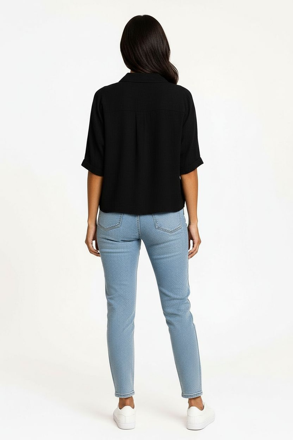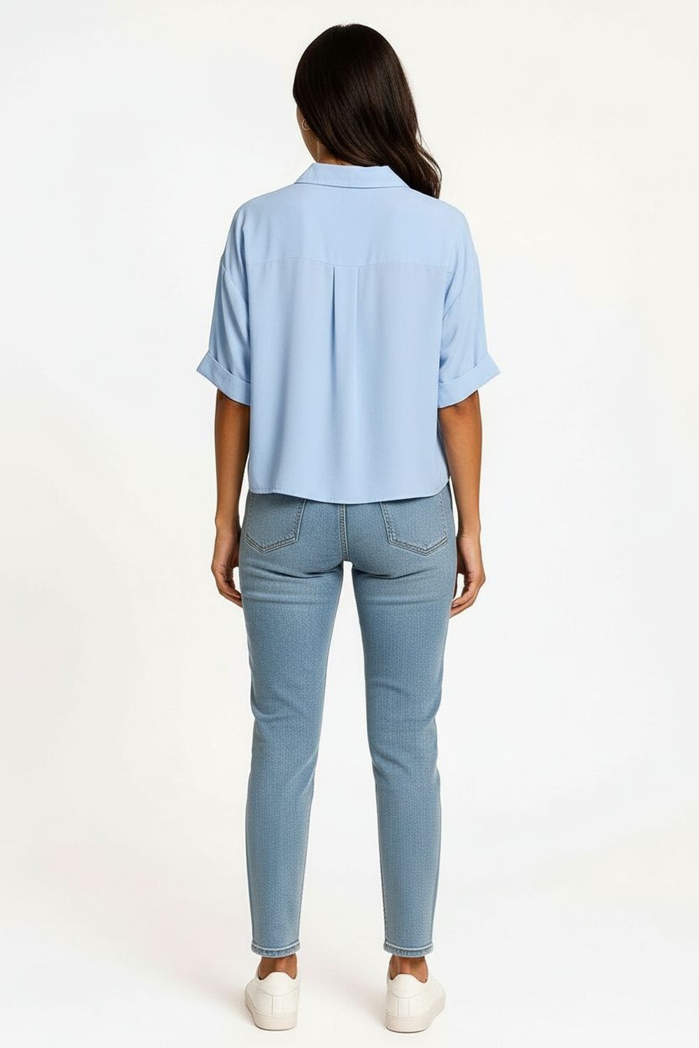 Blusa tipo camisera de corte recto con cuello clásico estructurado, manga corta de caída natural que brinda frescura, botonadura frontal funcional para ajuste práctico, confección en tejido ligero con textura suave al tacto, terminaciones limpias que mantienen una apariencia ordenada durante el uso