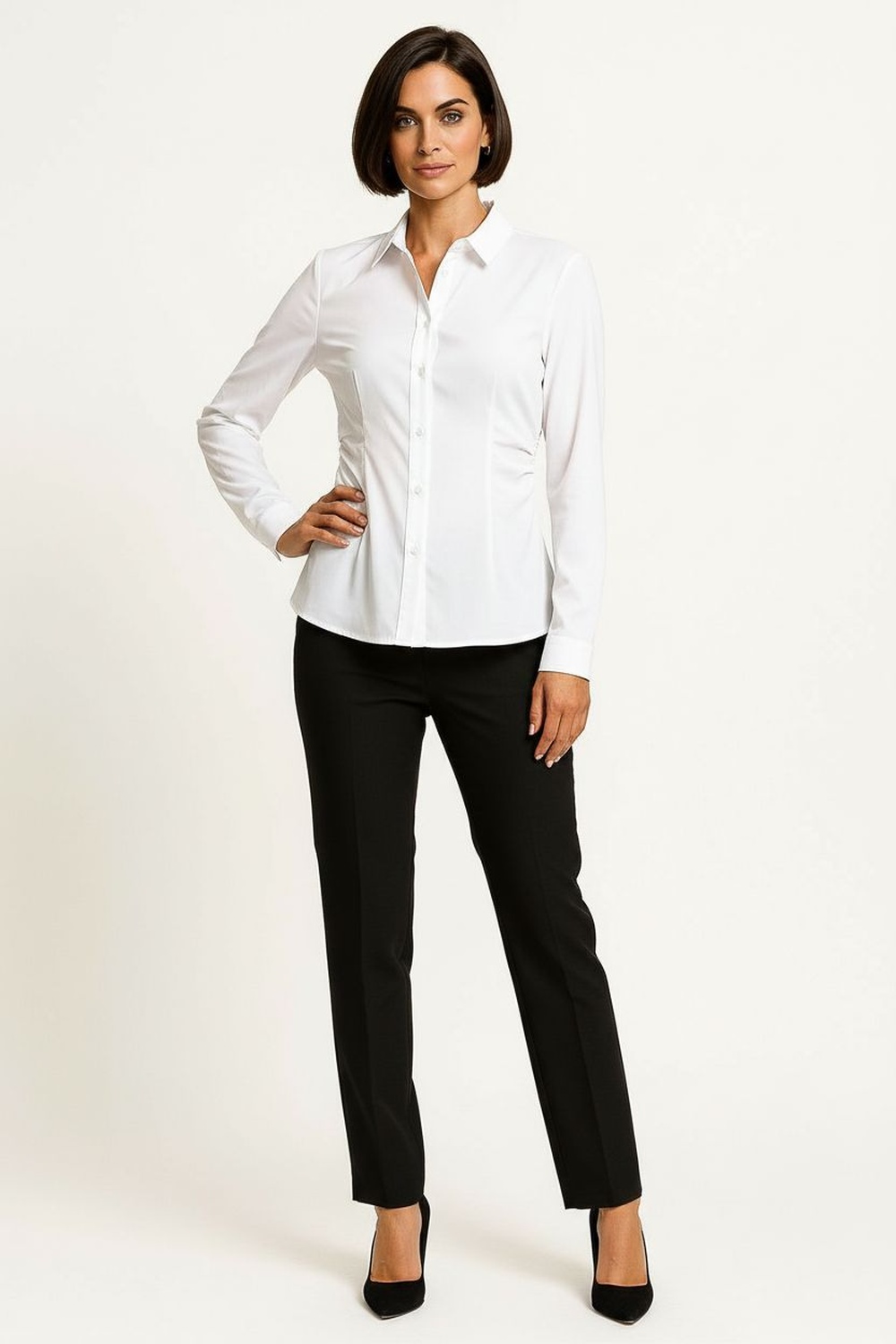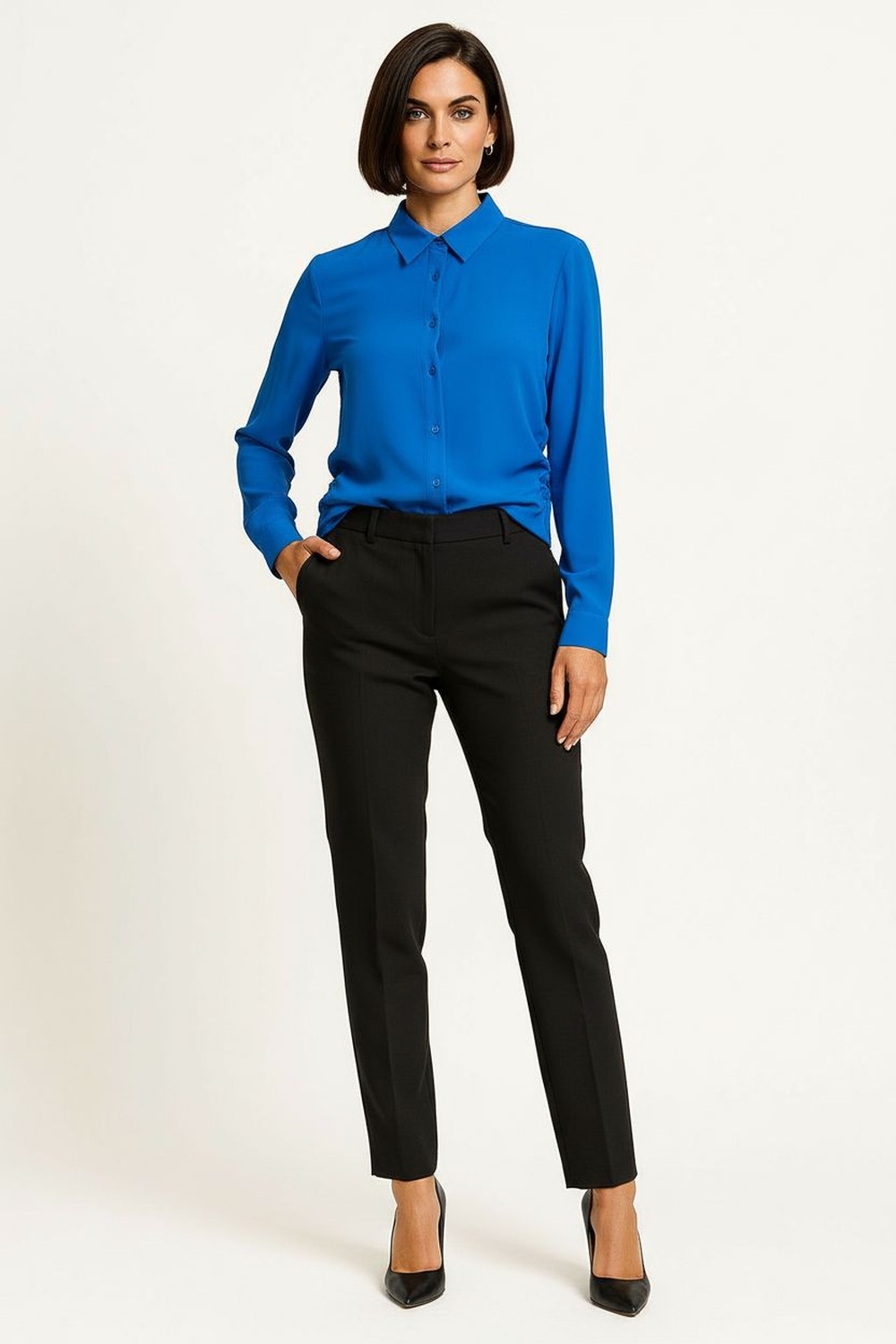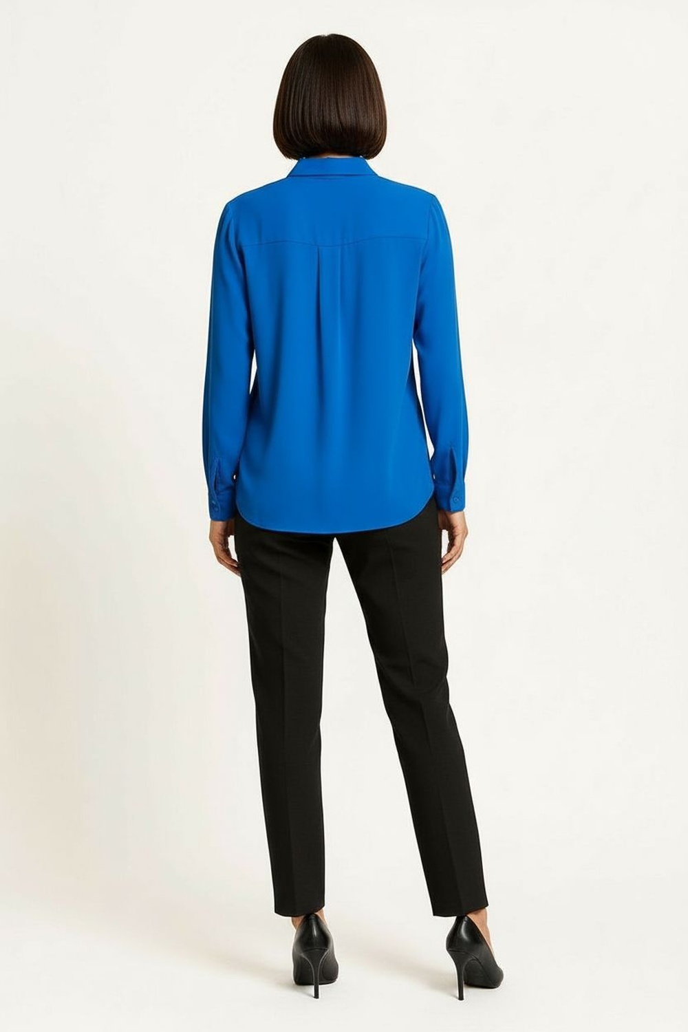 Blusa camisera de manga larga con botonadura frontal completa, cuello clásico estructurado que aporta presencia, corte recto con ligero entalle que define la silueta, puños con ajuste y caída suave que brinda comodidad durante todo el día, confección en tela ligera de tacto agradable y acabado limpio en dobladillo inferior