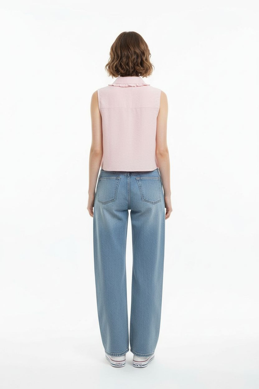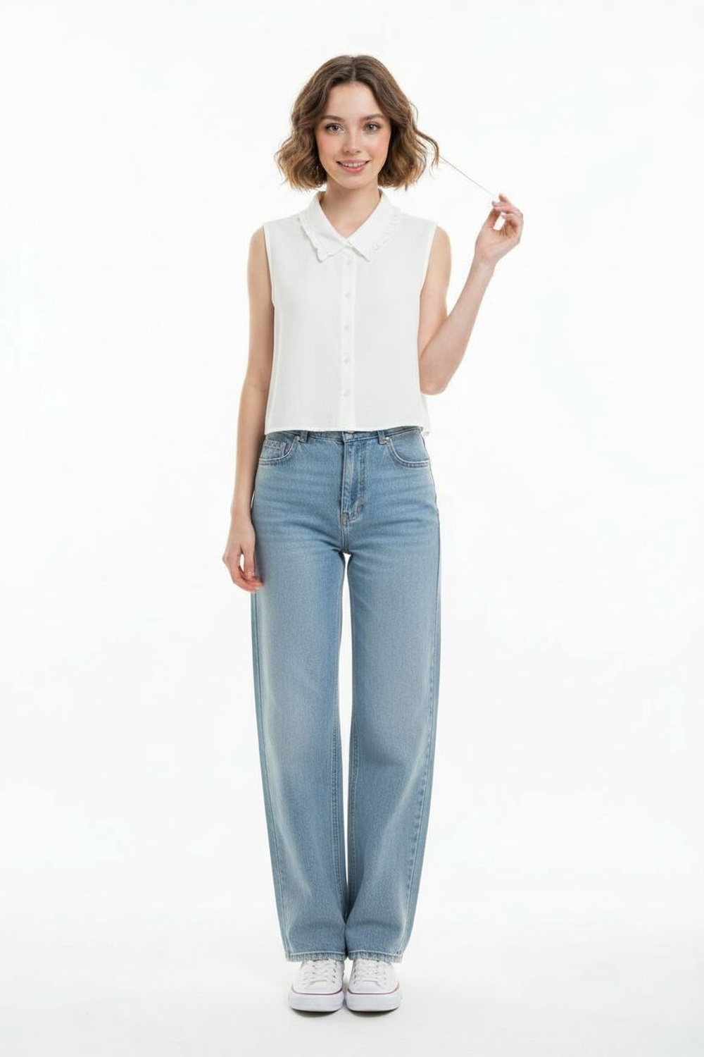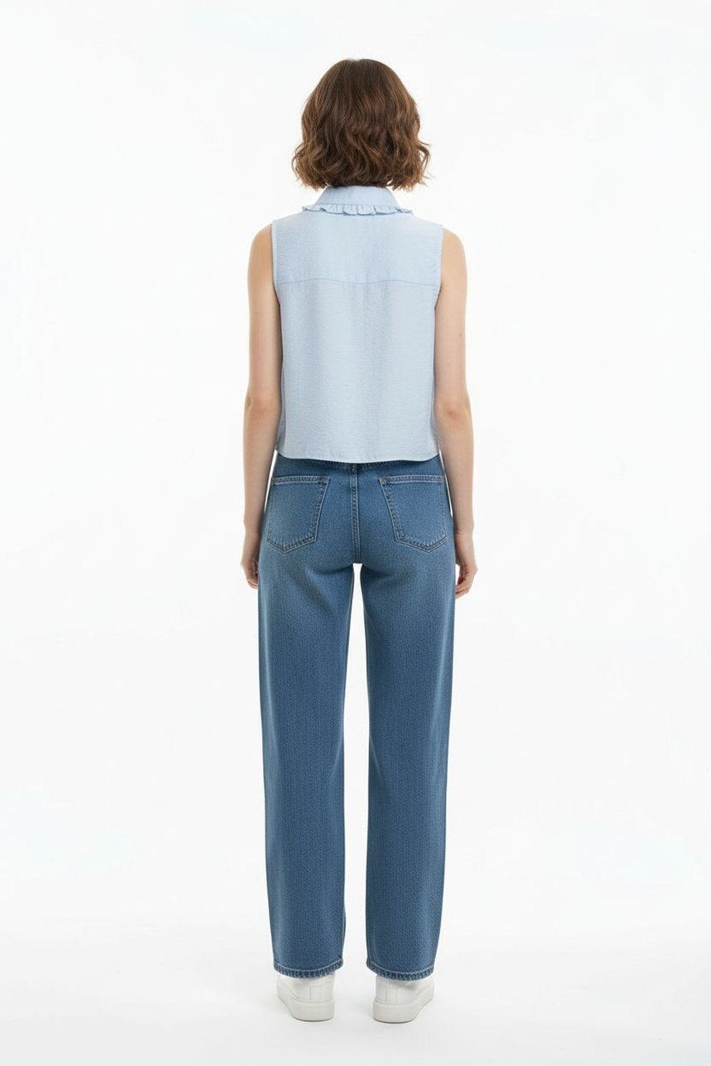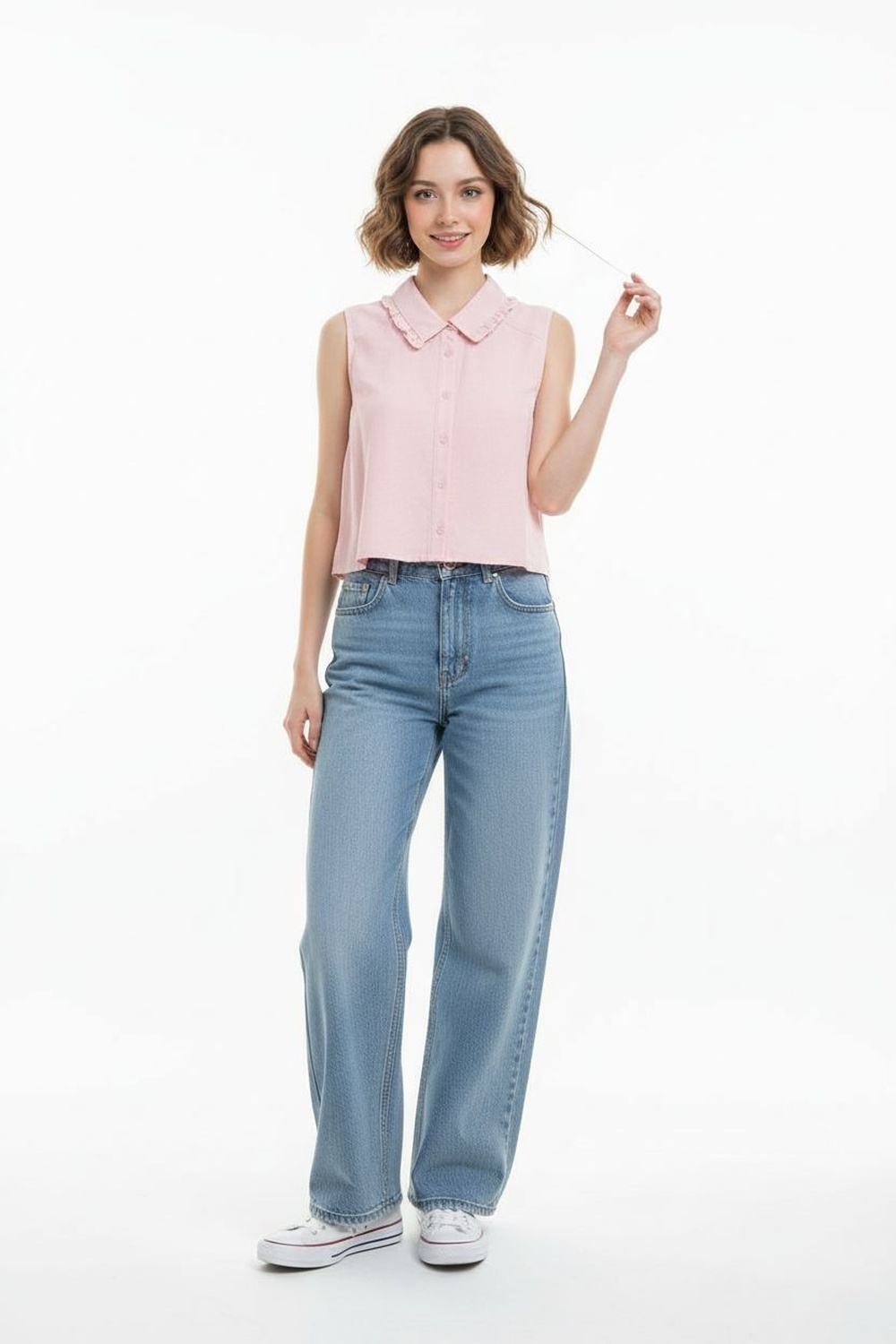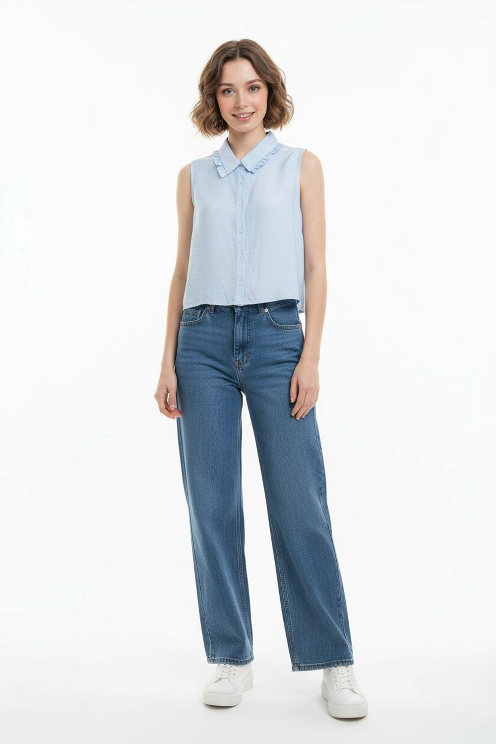 Blusa tipo camisera sin mangas con cuello y botonadura frontal corte recto y terminación inferior ligeramente curva