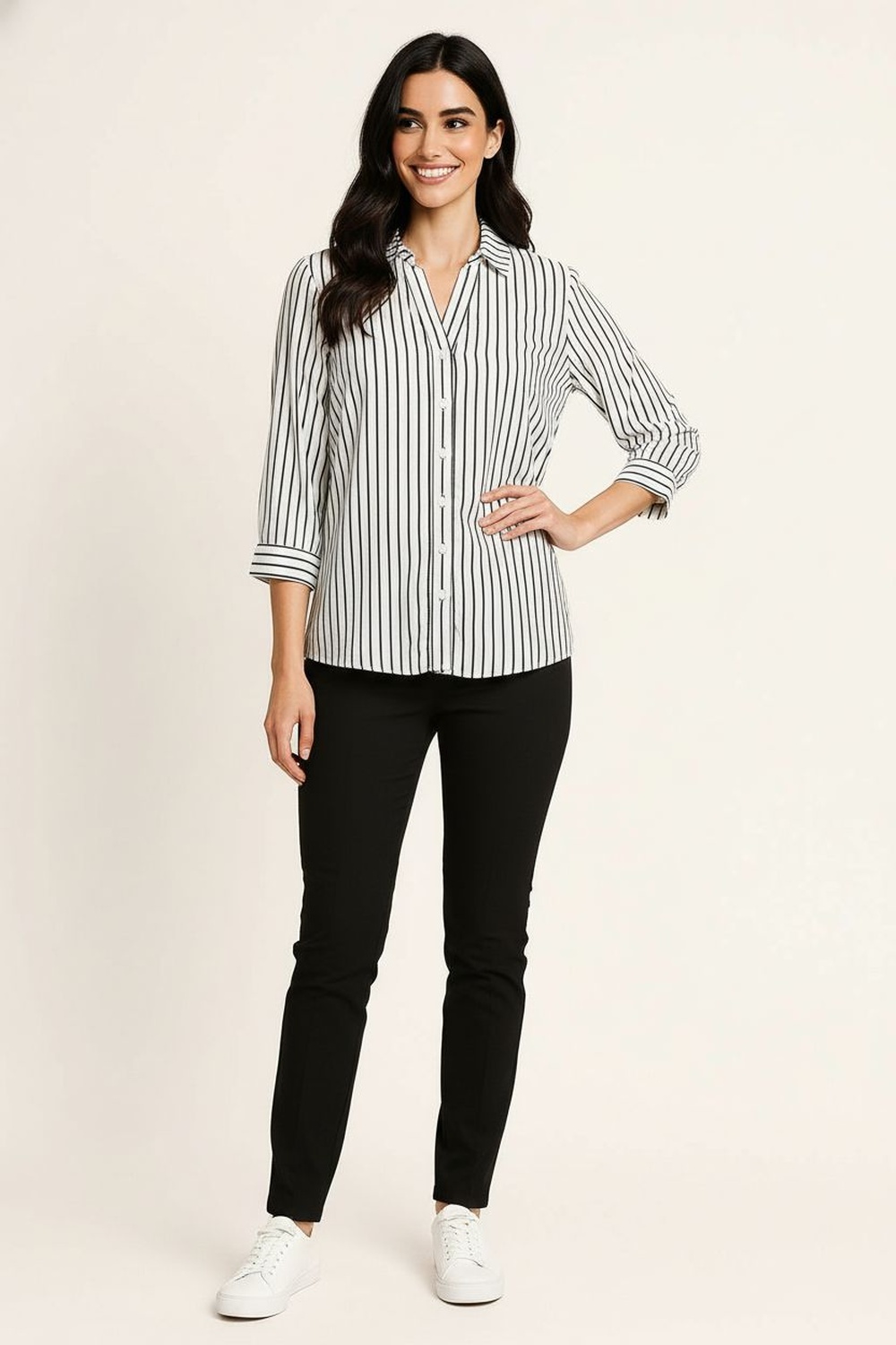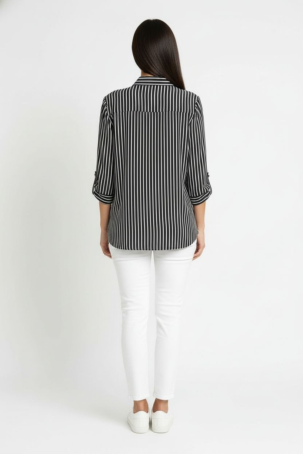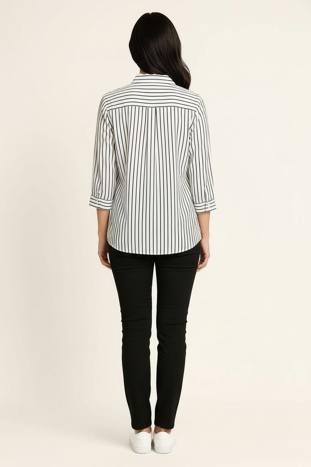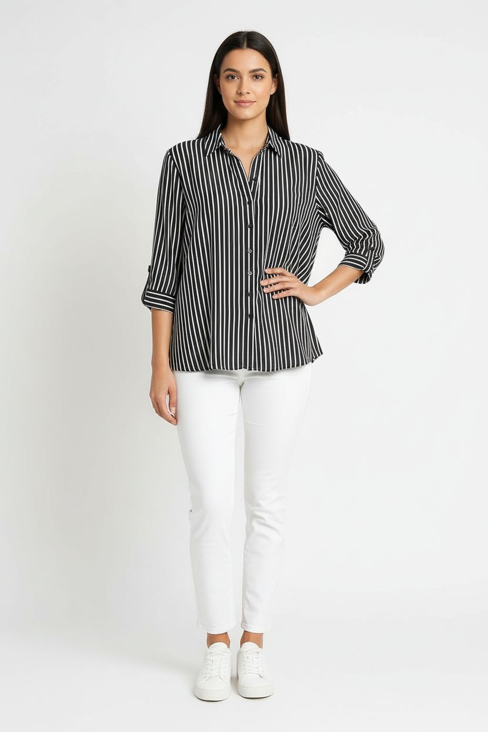 Blusa con cuello camisero y charreteras en los hombros, corte recto que brinda comodidad, botonadura frontal completa y puños con botón, confeccionada en tela ligera de textura suave con caída fluida