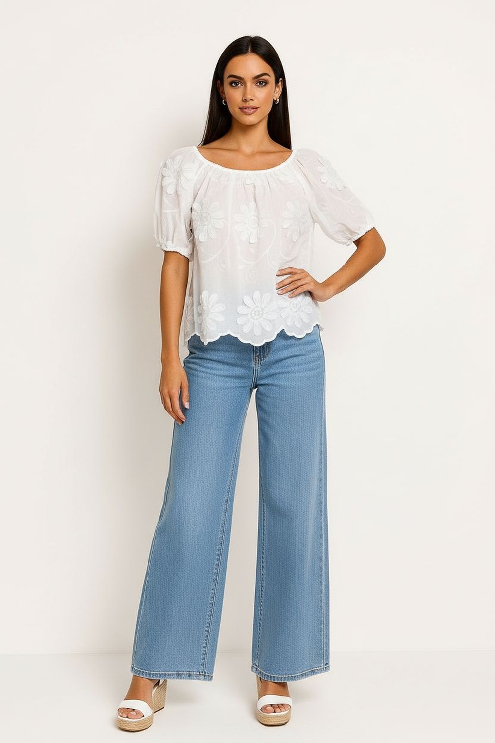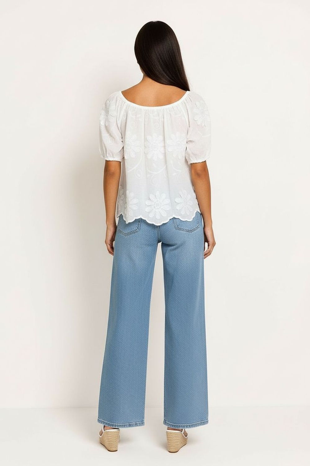 Blusa campesina de manga corta con escote amplio y ajuste elástico que brinda comodidad, silueta recta con caída ligera y detalle bordado frontal de acabado delicado que realza la prenda, confección fresca y suave al tacto con estructura ligera que permite libertad de movimiento y uso prolongado