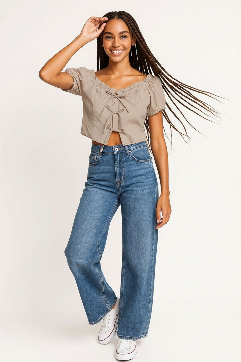 Blusa tipo campesina manga corta con elástico en hombros escote amplio con detalle de lazo al frente estructura entallada y largo corto