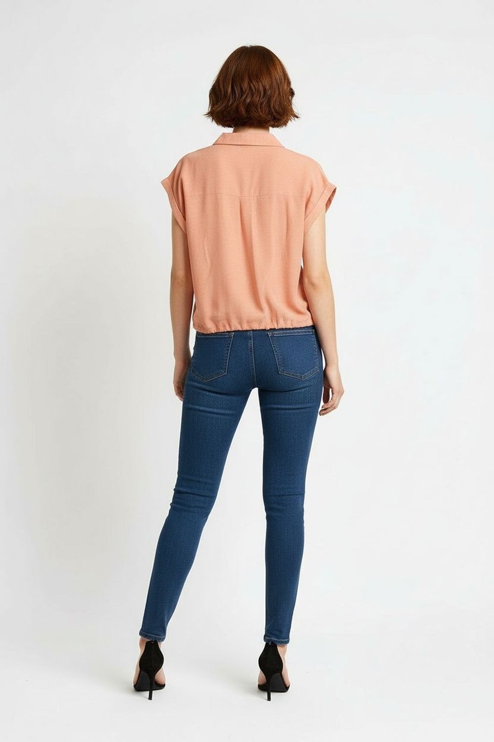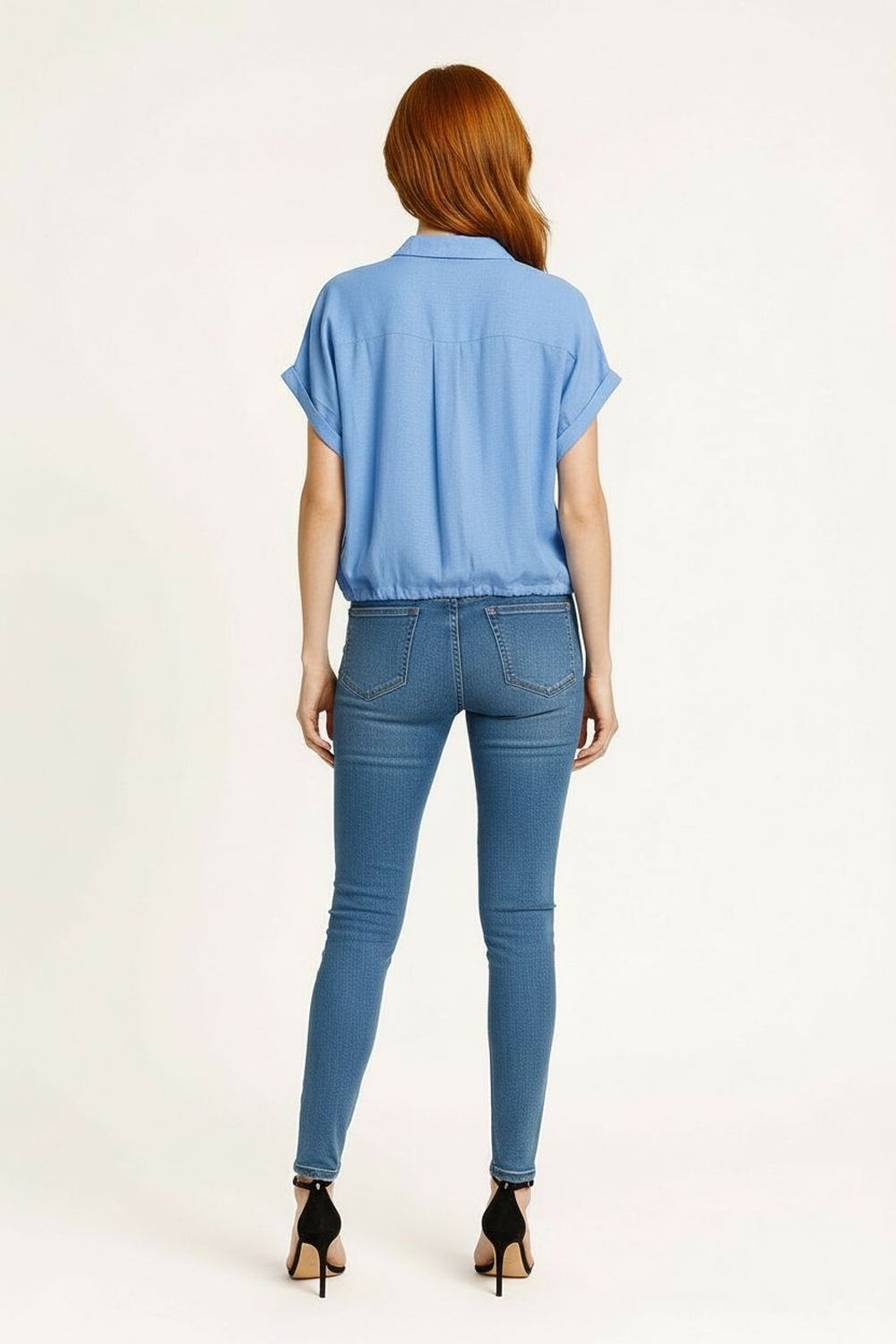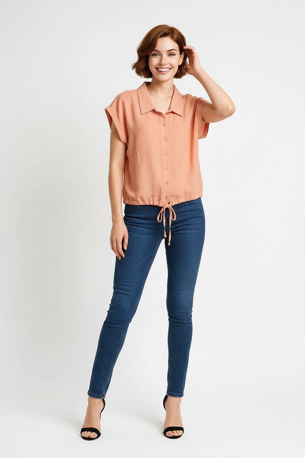 Blusa con cuello camisero, botonadura frontal completa, manga corta amplia, terminación inferior con jareta ajustable que permite modificar el fit, silueta cómoda y fluida