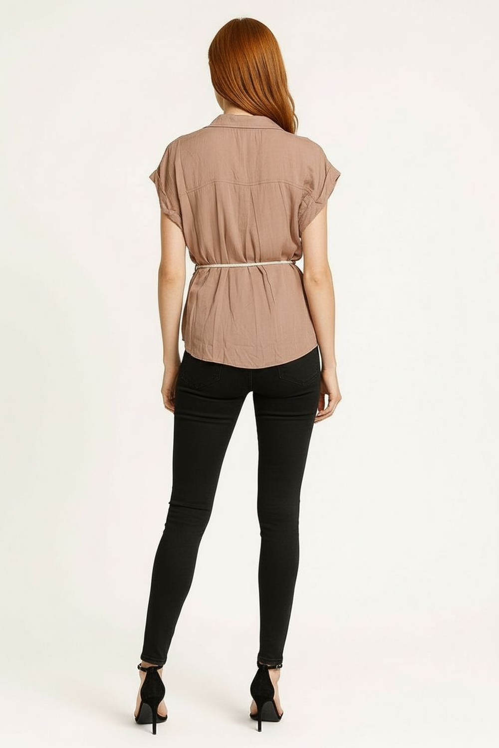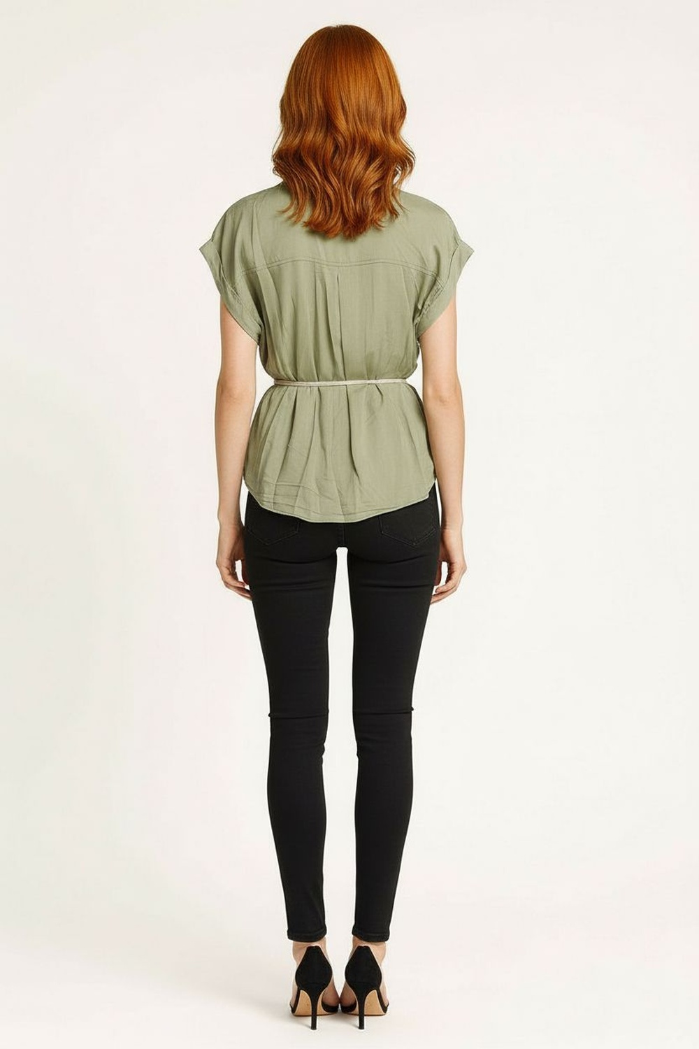 Blusa con cuello tipo camisero, manga corta con vuelta, botonadura frontal, bolsillo aplicado en pecho, ajuste con cinturón integrado en cintura, terminaciones limpias