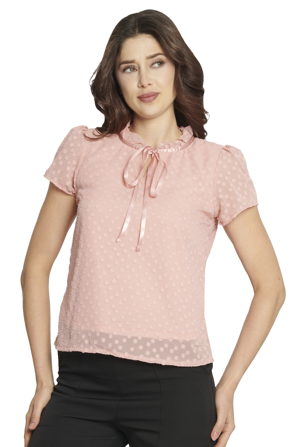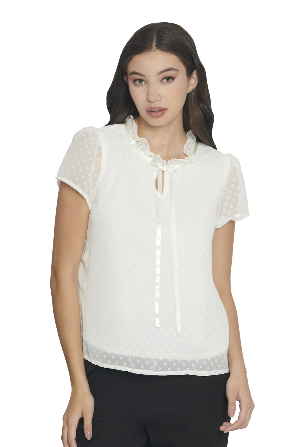Esta blusa casual elegante para mujer está confeccionada en tela ligera tipo yoryu con textura de puntos (“dot”) que le da un acabado delicado y femenino. El cuello estilo mao con fruncido y listón decorativo al frente aporta sofisticación, mientras que la abertura en forma de gota añade un detalle sutil y coqueto. Incluye forro interior para mayor cobertura sin perder la ligereza.