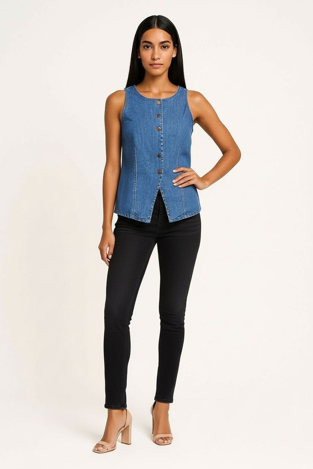 Blusa tipo chaleco sin mangas, escote redondo, botonadura frontal, pinzas de ajuste, terminación inferior curva