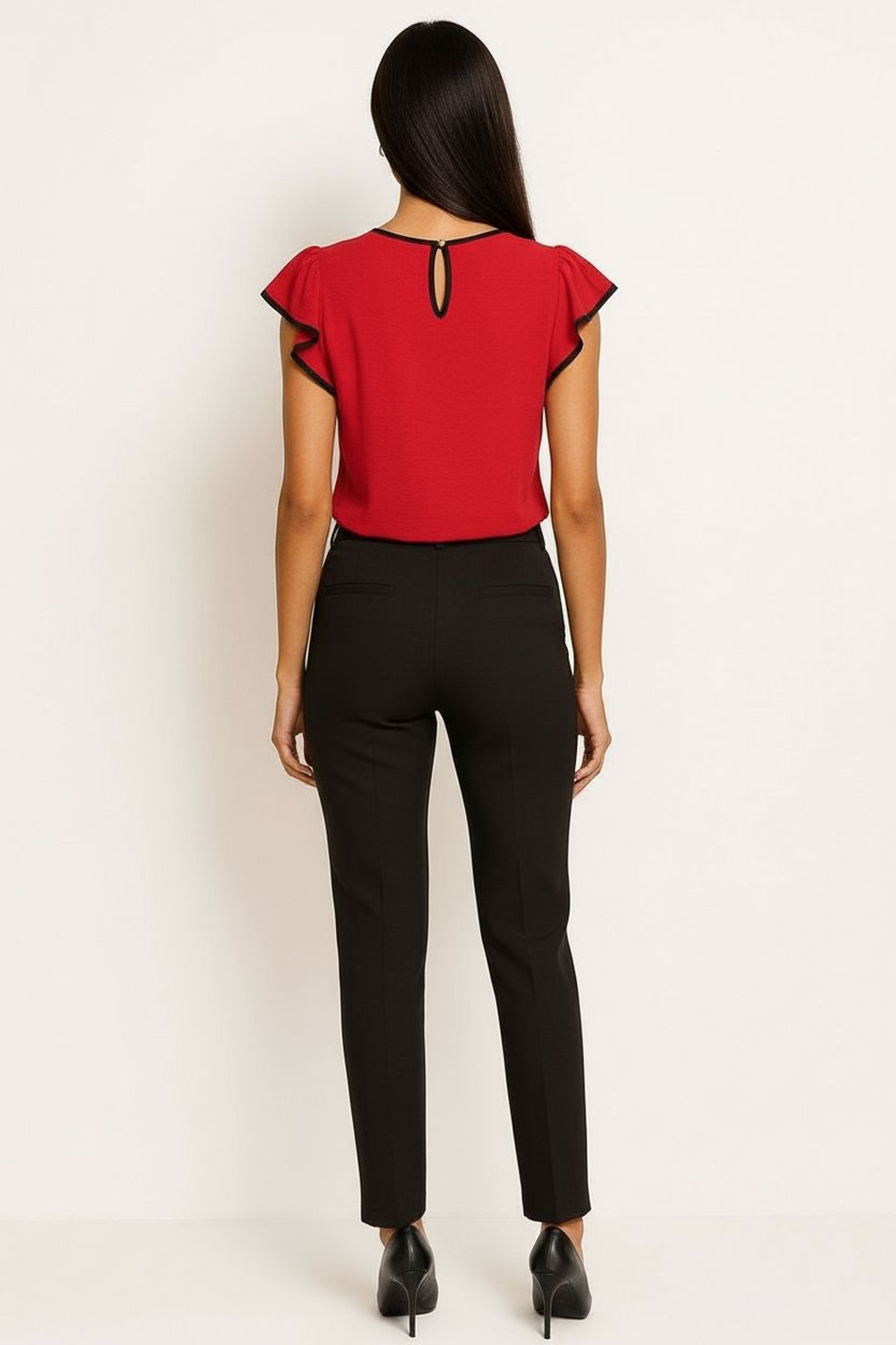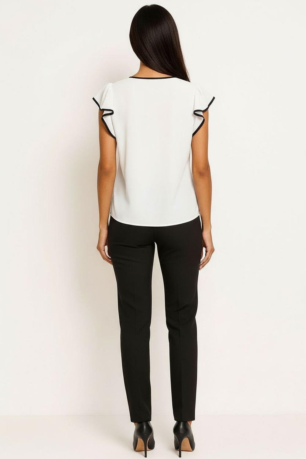 Blusa ligera con corte recto y caída fluida, cuello redondo con terminación limpia, diseño con paneles frontales que aportan dimensión visual, manga corta con caída natural y tejido suave que ofrece comodidad durante todo el día