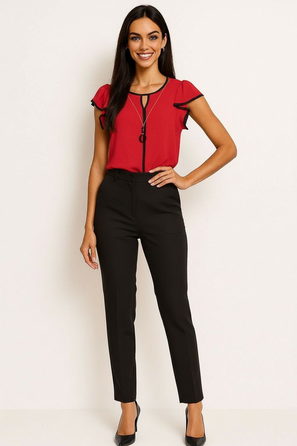 Blusa de manga corta con escote redondeado y abertura frontal decorativa que aporta un toque distintivo, confección en tejido ligero de textura suave que favorece la comodidad, mangas con caída sutil que brindan libertad de movimiento, diseño fluido con acabado pulido ideal para uso continuo