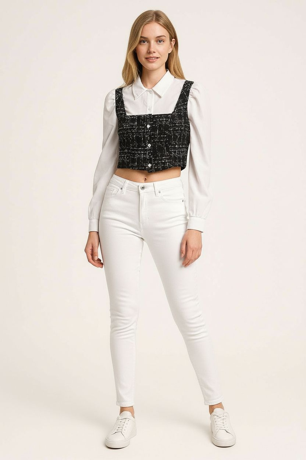 Blusa de manga larga con cuello camisero clásico que aporta elegancia, diseño combinado con chaleco integrado de corte recto que añade contraste y modernidad, confección en tejido ligero y suave que brinda comodidad durante el día, botones al frente que aseguran practicidad, ideal para outfits formales y combinaciones modernas de temporada