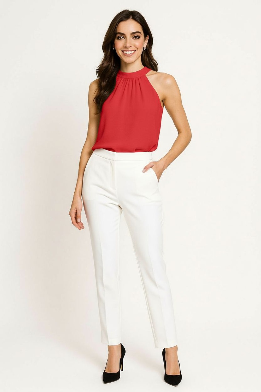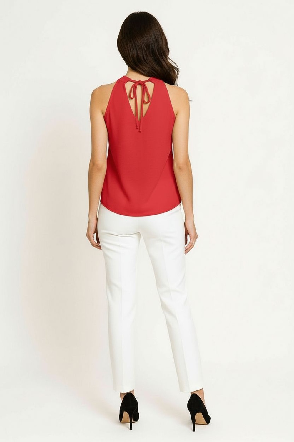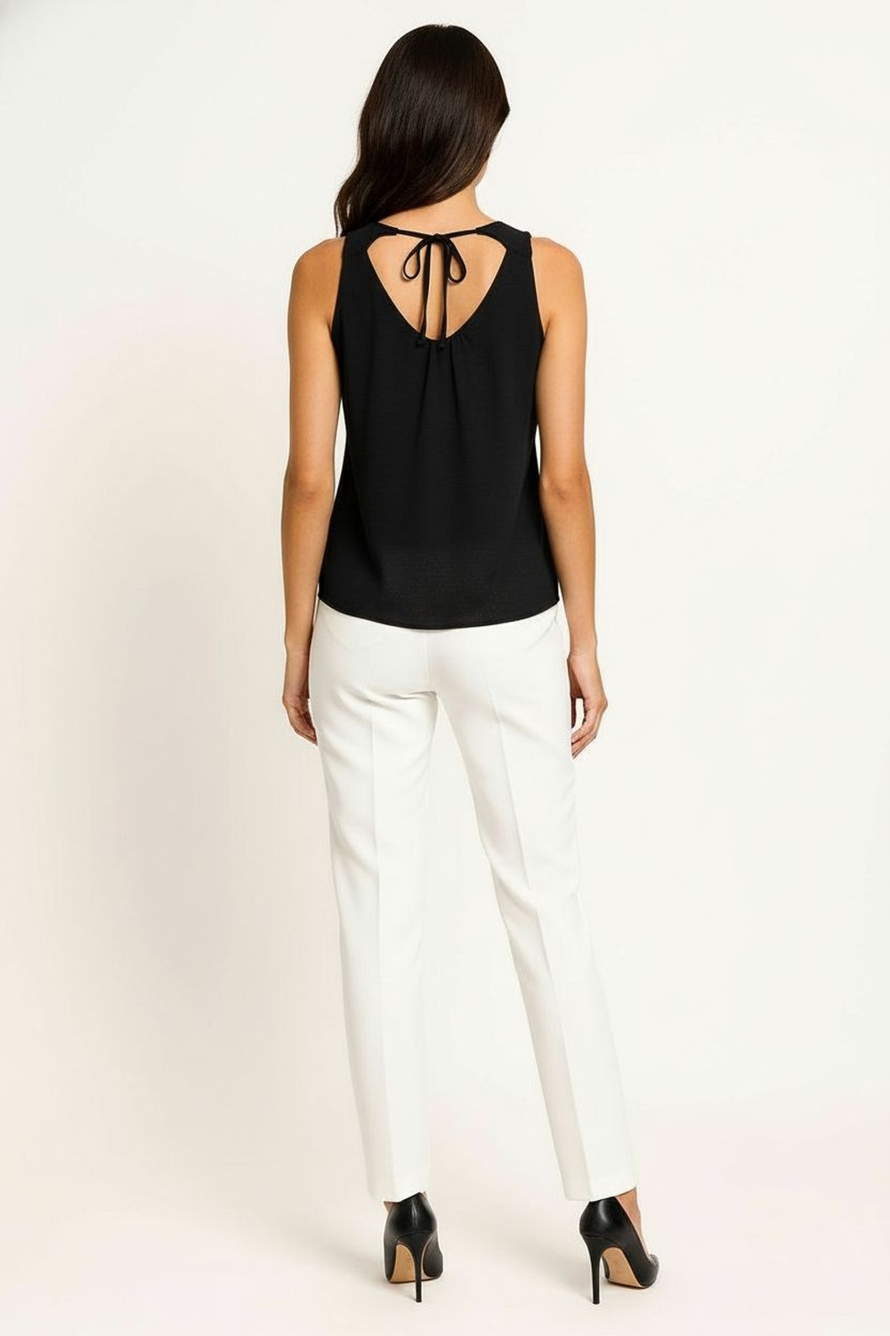 Blusa sin mangas con escote redondo al frente y abertura posterior con lazo ajustable que permite adaptar el ajuste, caída fluida que aporta movimiento, confección en tela ligera con textura suave al tacto, terminaciones limpias que aportan un acabado delicado y pulido