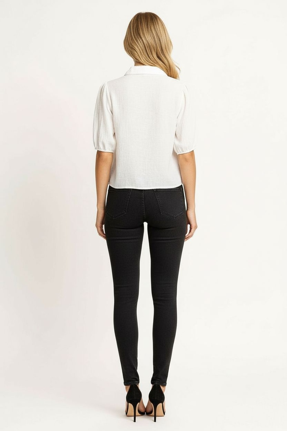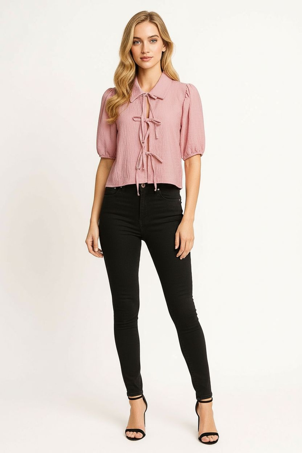 Blusa de manga corta con volumen, escote con abertura, sistema de amarres frontales, textura ligera, caída suelta, ajuste cómodo
