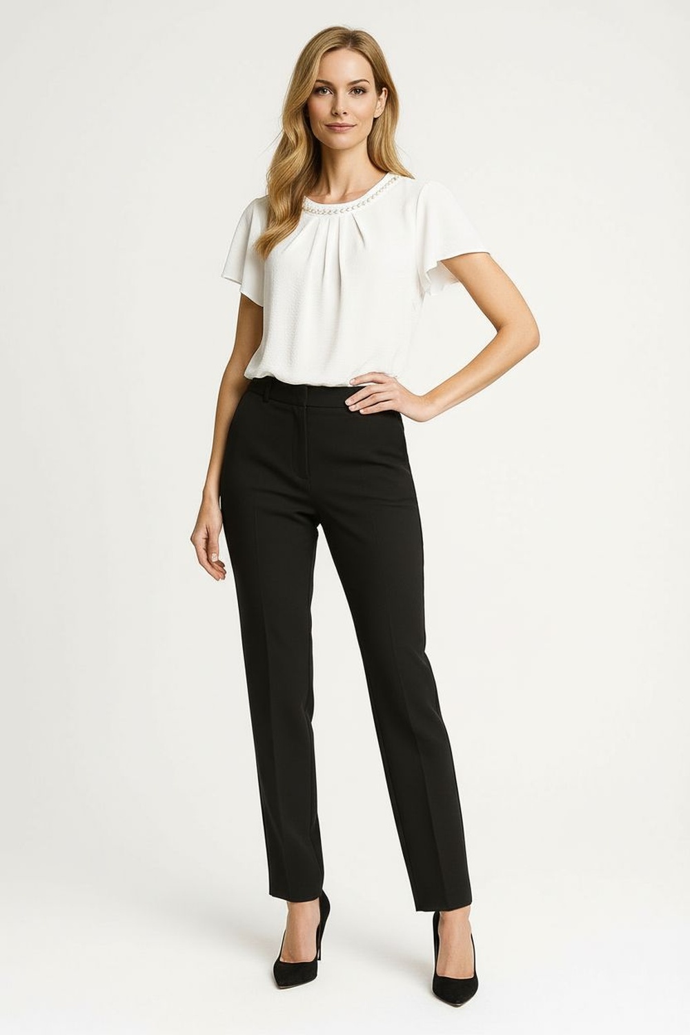 Pantalón de tiro medio con pretina estructurada que ofrece ajuste definido, botonadura decorativa lateral que añade detalle visual, corte recto que mantiene una línea estilizada, largo al tobillo que equilibra la proporción, confección en tejido resistente con acabado suave al tacto