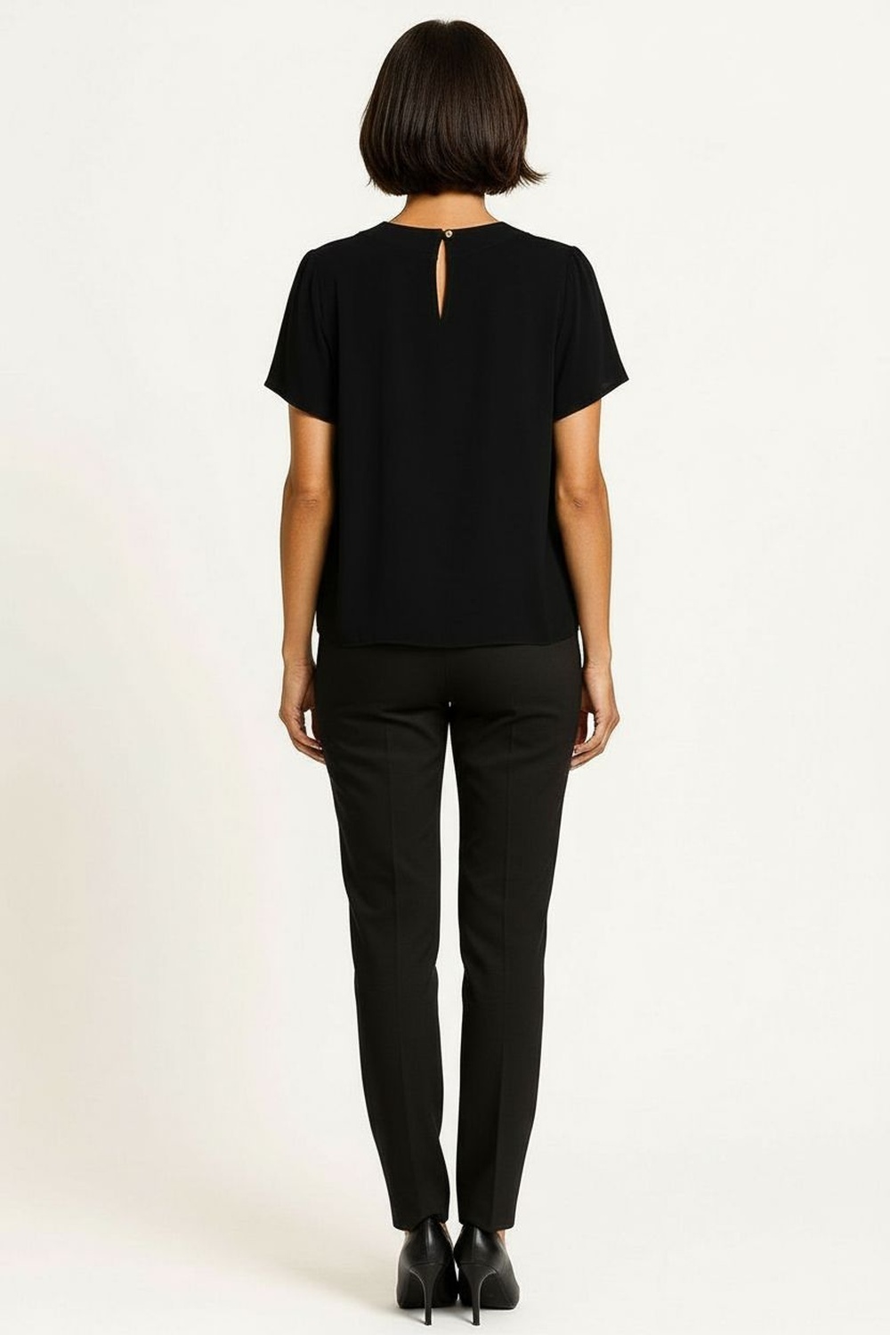 Blusa de manga corta con cuello redondo y detalle decorativo integrado, corte recto que ofrece caída fluida, pliegue frontal que aporta amplitud y comodidad, abertura posterior con botón funcional para mejor ajuste, confección en tejido ligero de tacto suave