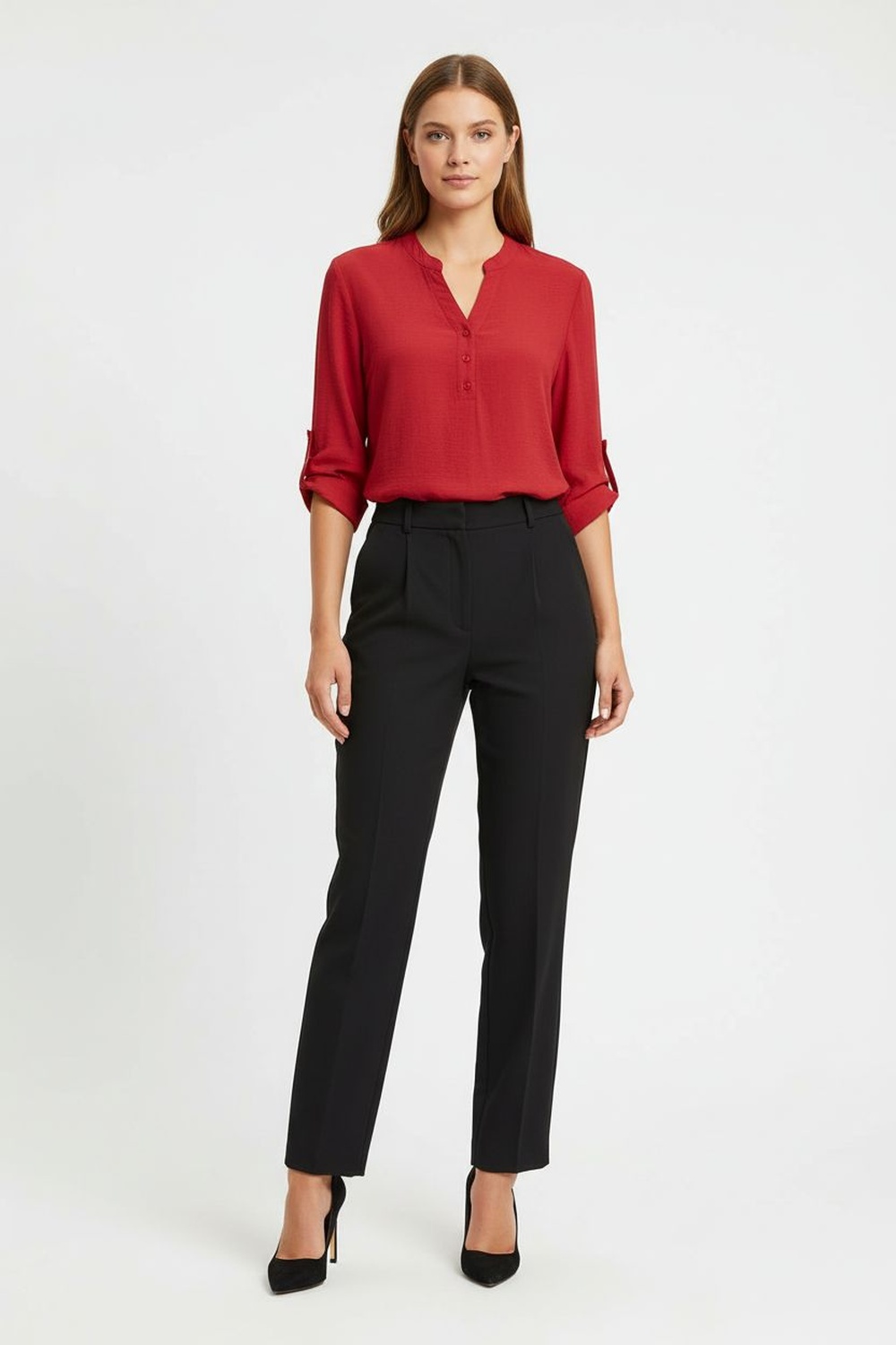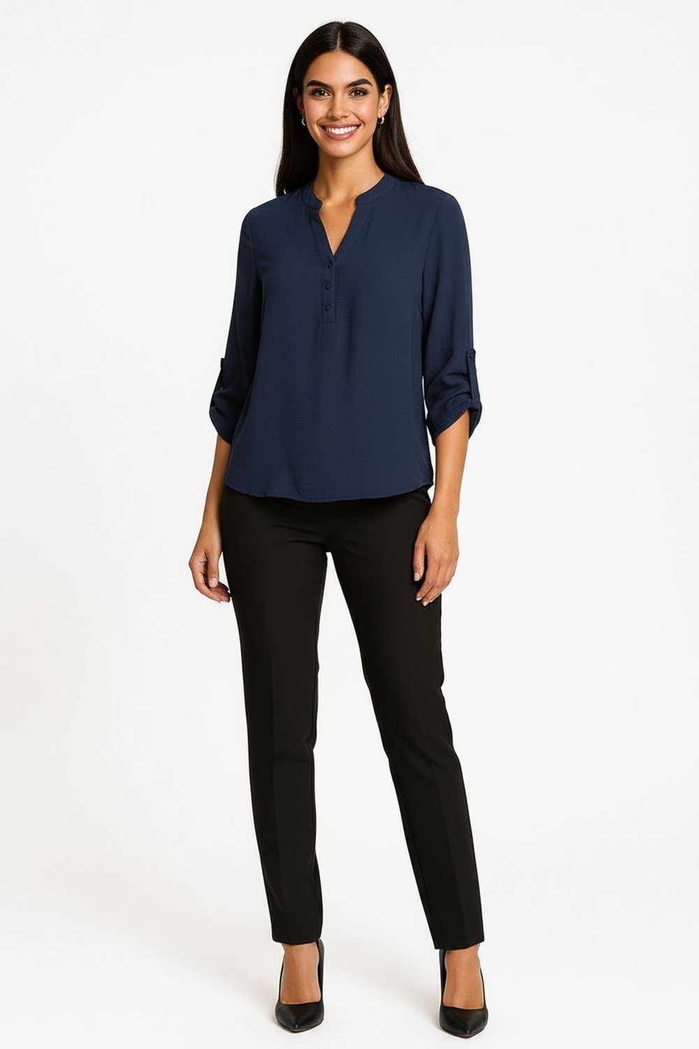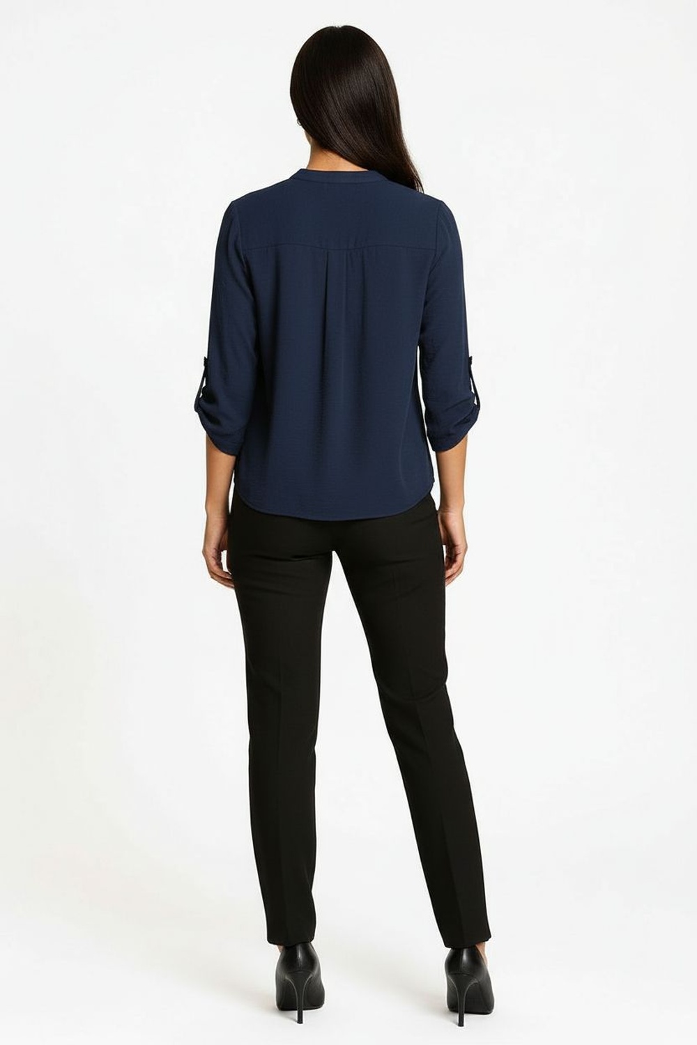 Blusa ligera con cuello mao y escote en “V” que estiliza el cuello, mangas largas con opción de doblado sujetas por presilla y botón, caída fluida que favorece la silueta sin ajustar, terminación curva en el bajo que aporta movimiento y versatilidad