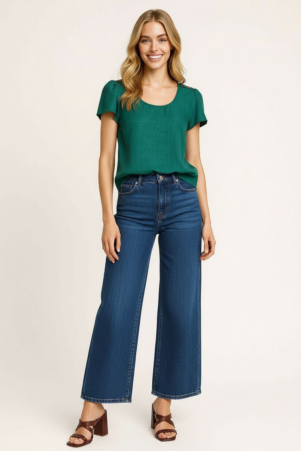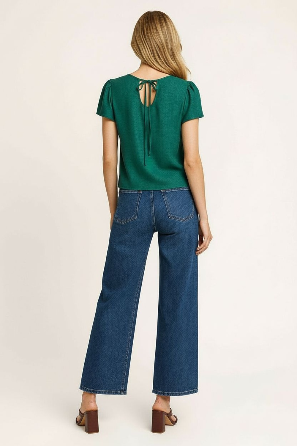 Blusa de manga corta con escote redondo amplio que brinda comodidad al portar, corte recto que permite ajuste relajado, hombros con ligero volumen que aportan estructura a la prenda, cierre frontal funcional con botones decorativos en hombro, espalda con abertura y amarre que mejora el ajuste, confección en tejido ligero con caída suave