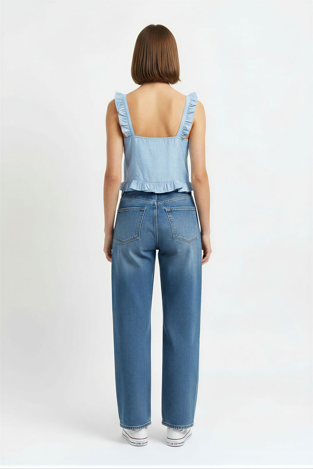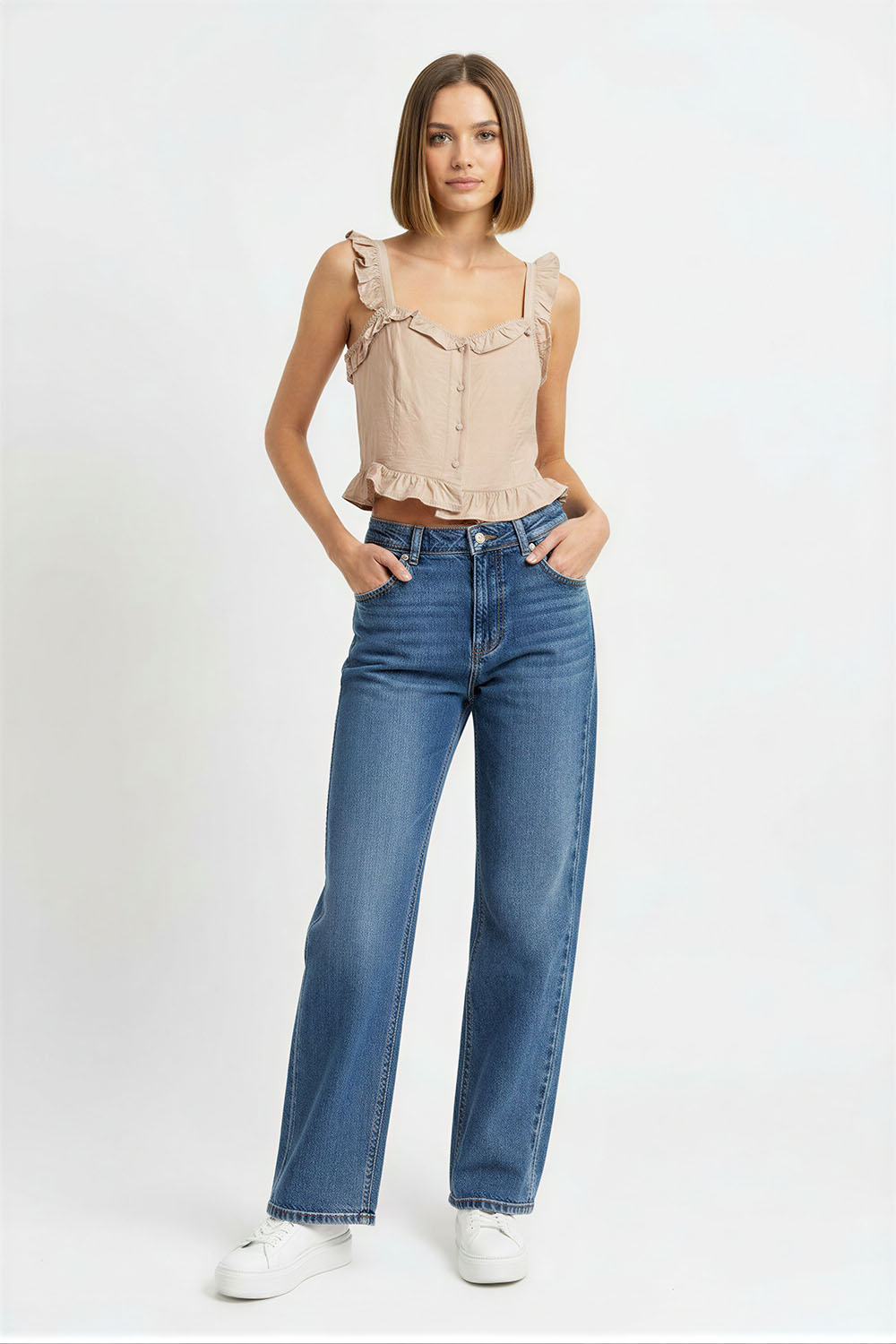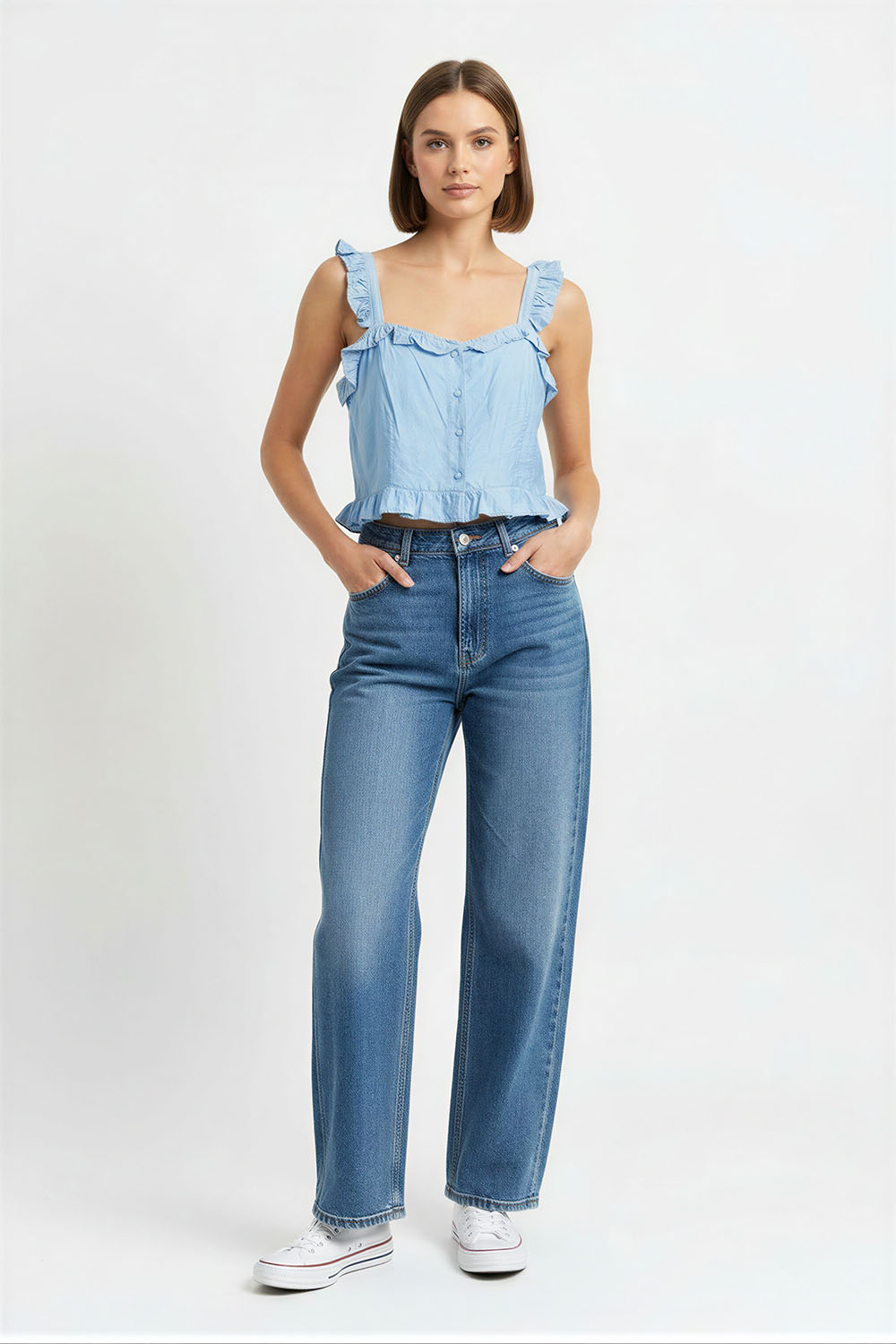 Blusa con tirantes anchos y escote recto con detalle de olanes que aportan volumen, diseño con botonadura frontal funcional que facilita su uso, corte recto con ligero vuelo inferior que brinda comodidad, confección ligera que permite frescura durante el día