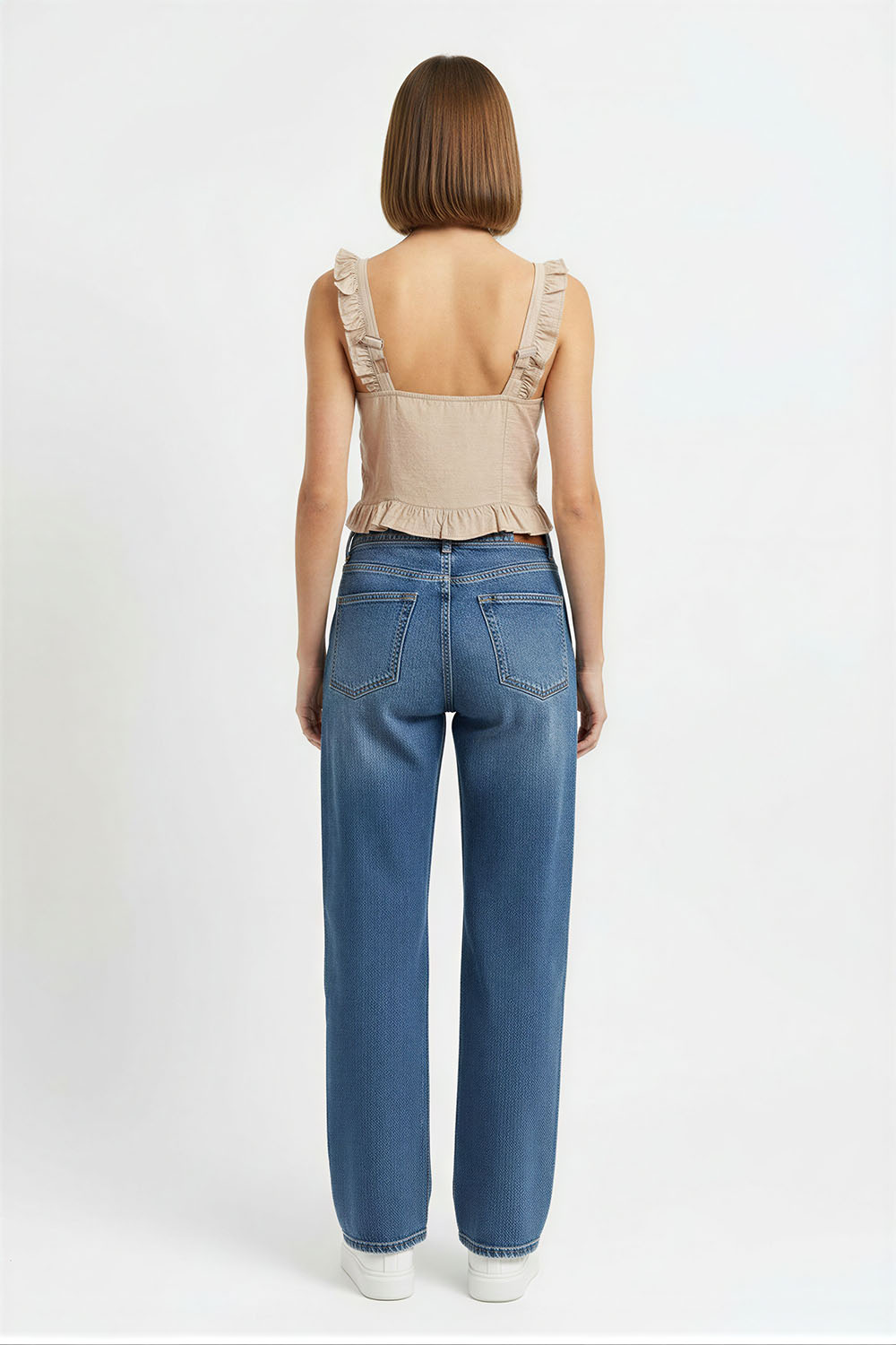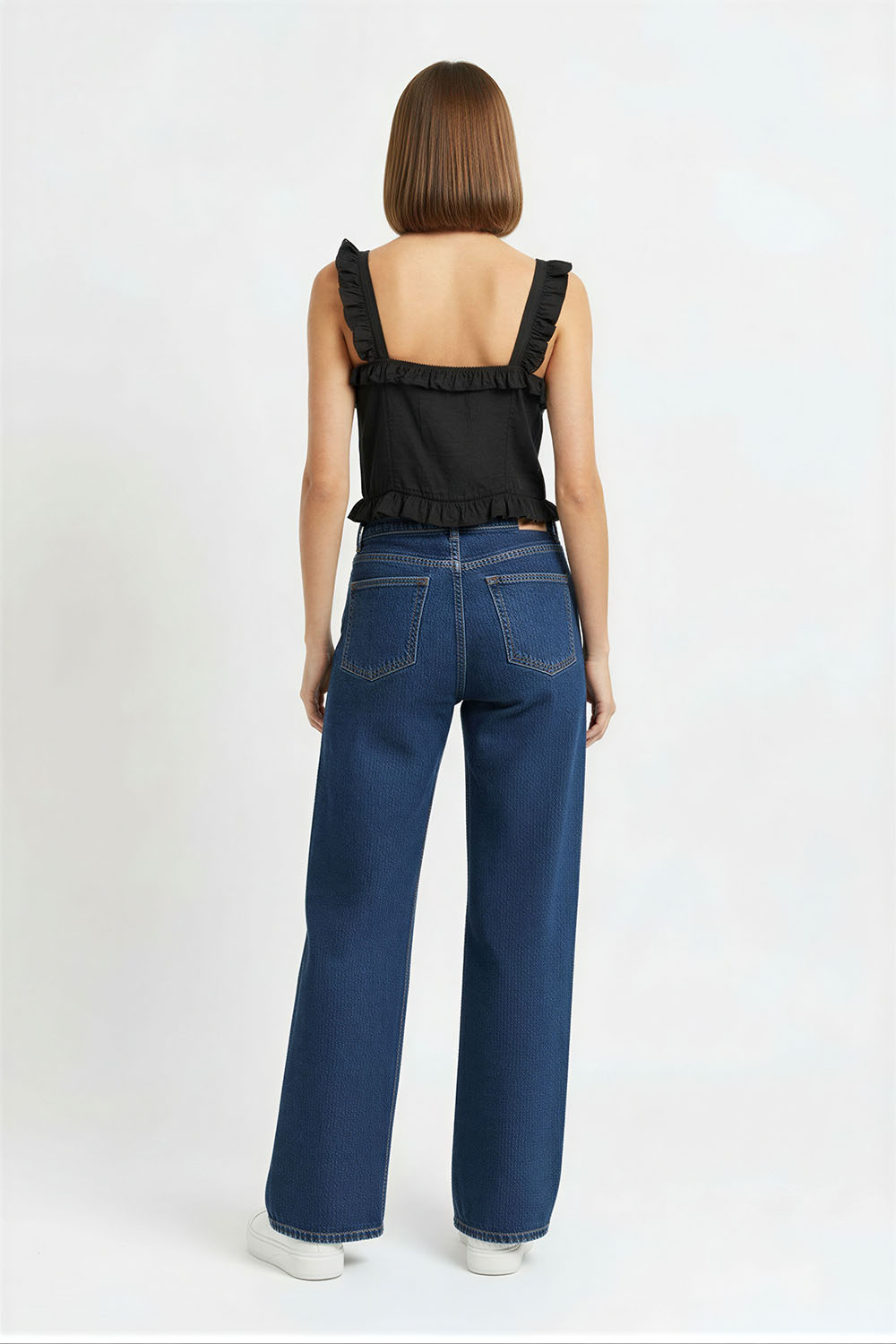 Blusa embosa sin mangas con tirantes ajustables que permiten adaptar el ajuste, escote recto que equilibra la parte superior, corte a la cintura con olan en la parte baja que aporta movimiento, confección en tela con textura que añade dimensión, estructura ligera que brinda comodidad y libertad al portar