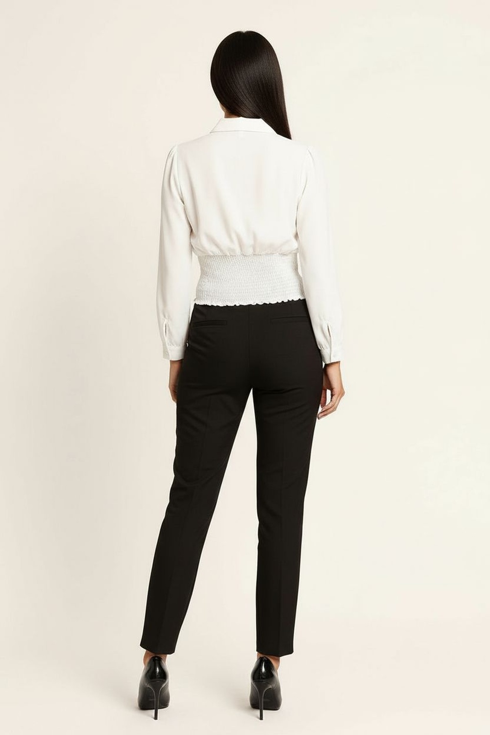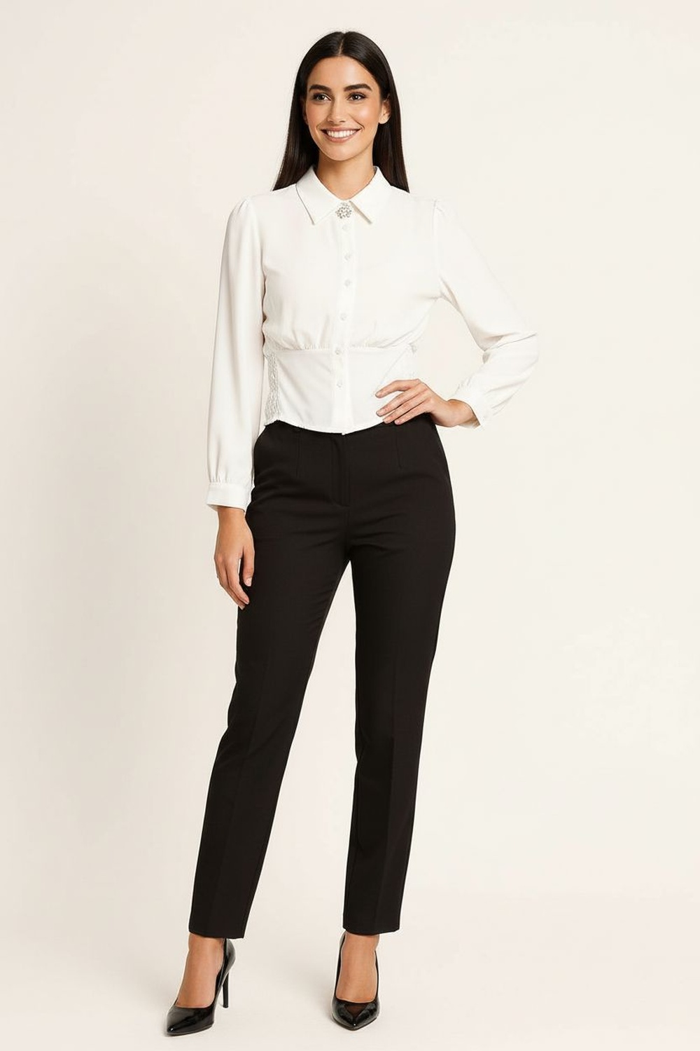 Blusa de manga larga con cuello camisero estructurado que aporta un aire sofisticado, cierre frontal con botones y broche decorativo que realza el diseño, pinzas al frente que definen la silueta, espalda con franja elástica que brinda ajuste cómodo y favorece la forma natural del cuerpo, confeccionada en tejido ligero con acabado suave al tacto