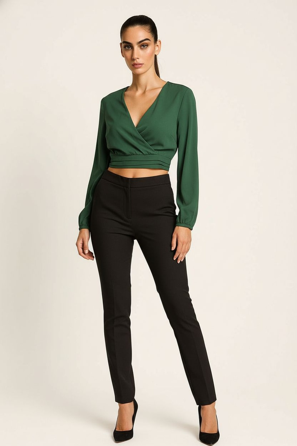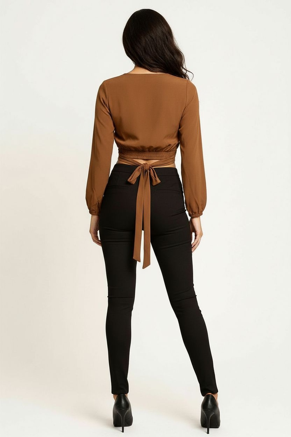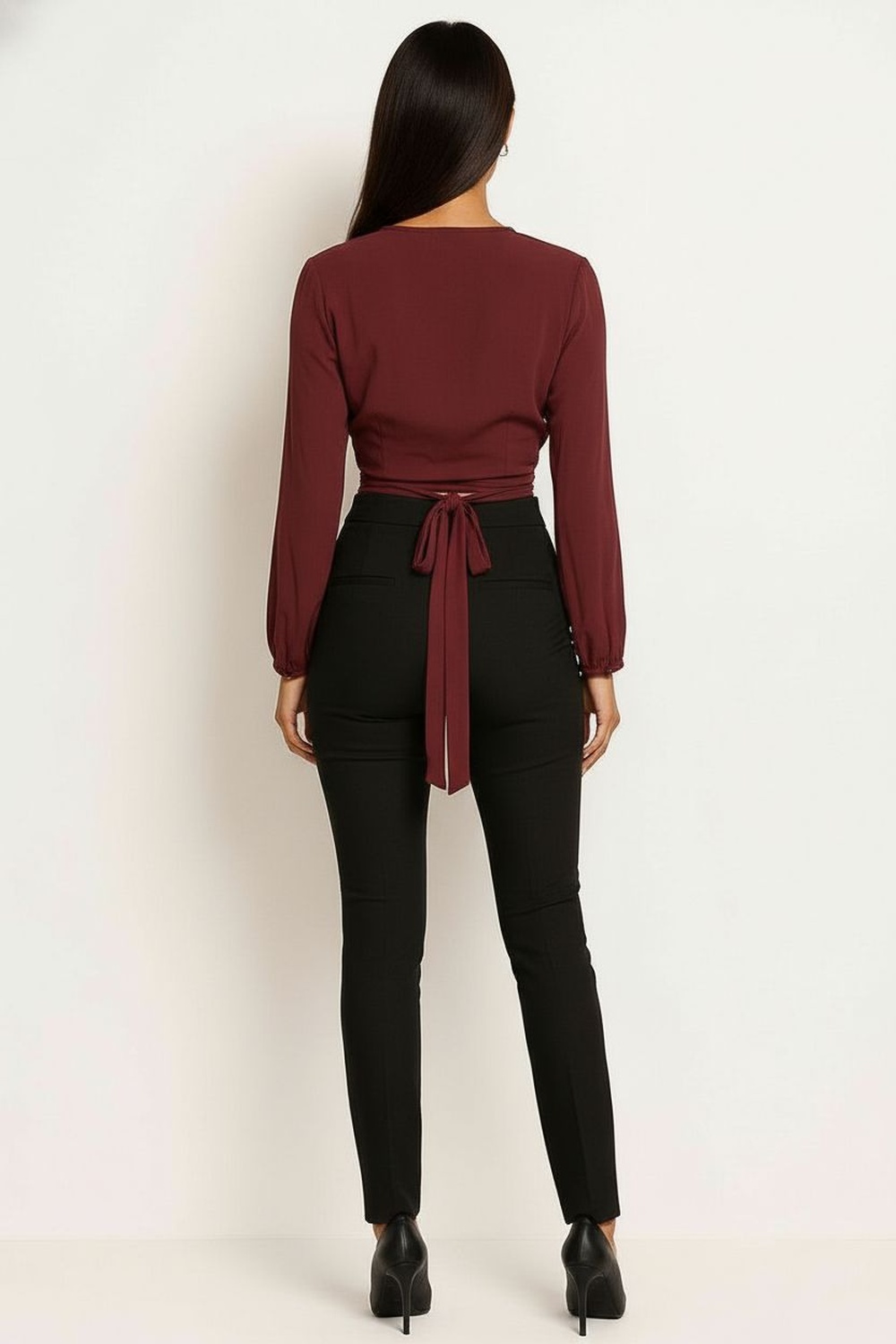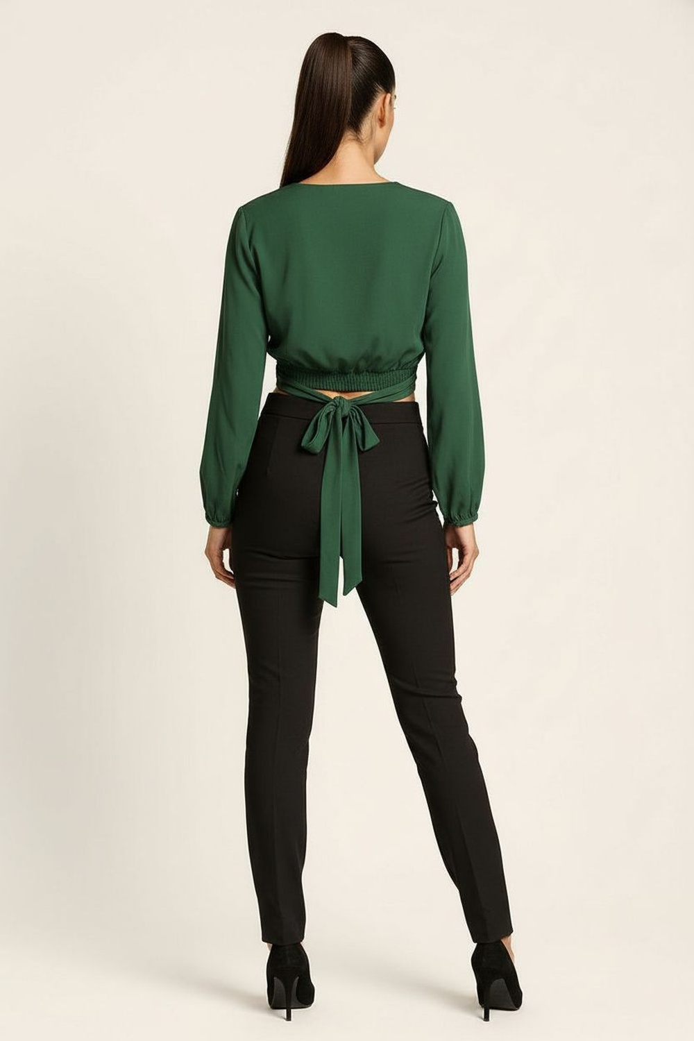 Blusa cruzada de escote en V que resalta el cuello, amarre ajustable en cintura que permite definir la silueta, manga larga con puño elástico que aporta volumen ligero, tejido suave y fluido que ofrece caída natural y confort al movimiento