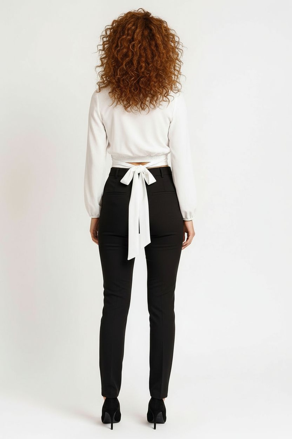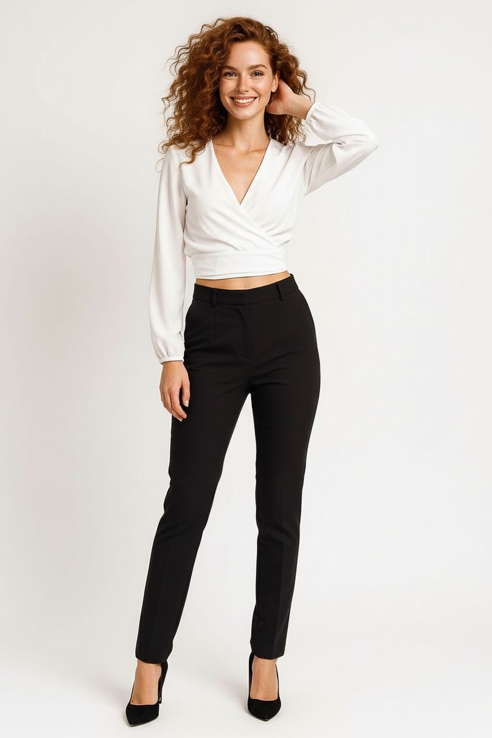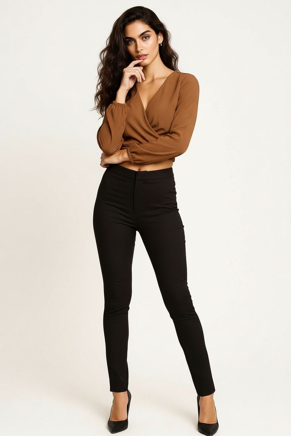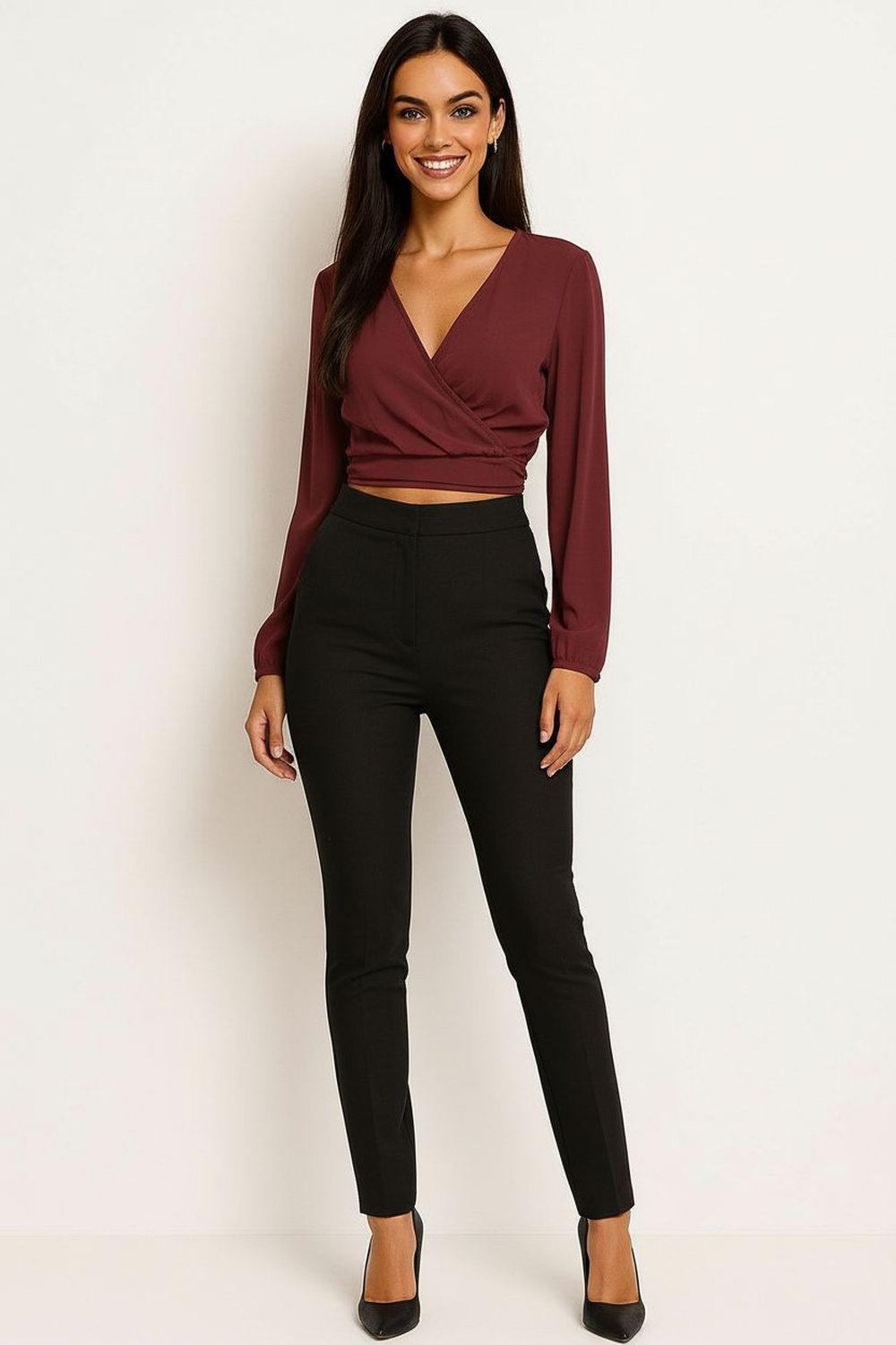 Blusa cruzada de escote en V que resalta el cuello, amarre ajustable en cintura que permite definir la silueta, manga larga con puño elástico que aporta volumen ligero, tejido suave y fluido que ofrece caída natural y confort al movimiento