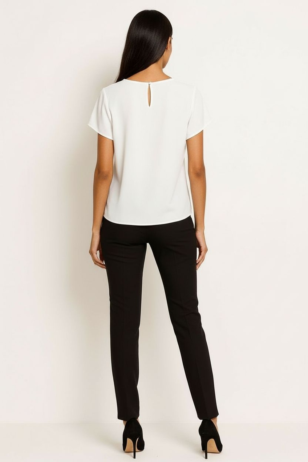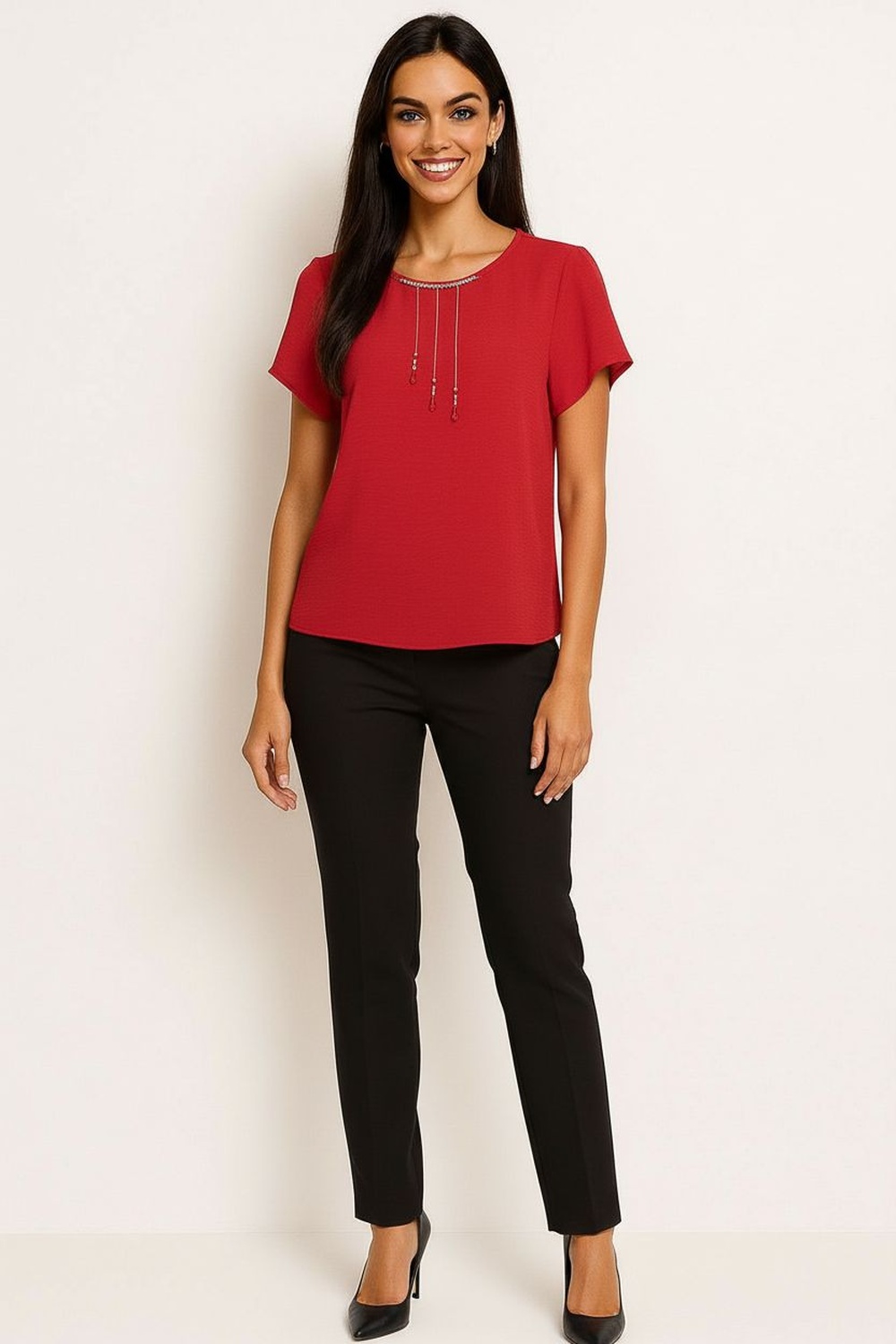 Blusa de silueta recta con escote redondo clásico y aplicación de accesorio integrado al frente que estiliza el área superior, manga corta de corte limpio que facilita movilidad, confección en tela ligera con textura sutil que aporta mayor comodidad, largo a la cadera con acabado uniforme que brinda caída natural y ajuste relajado