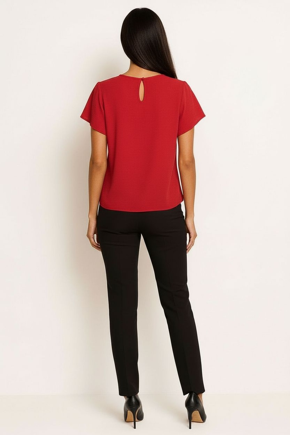 Blusa de tirantes finos con escote halter que estiliza la figura, confeccionada en tela ligera y fresca ideal para climas cálidos, pliegues frontales que aportan caída elegante, abertura trasera con cierre de botón para un ajuste sencillo, perfecta para crear combinaciones casuales o semi formales con un toque femenino