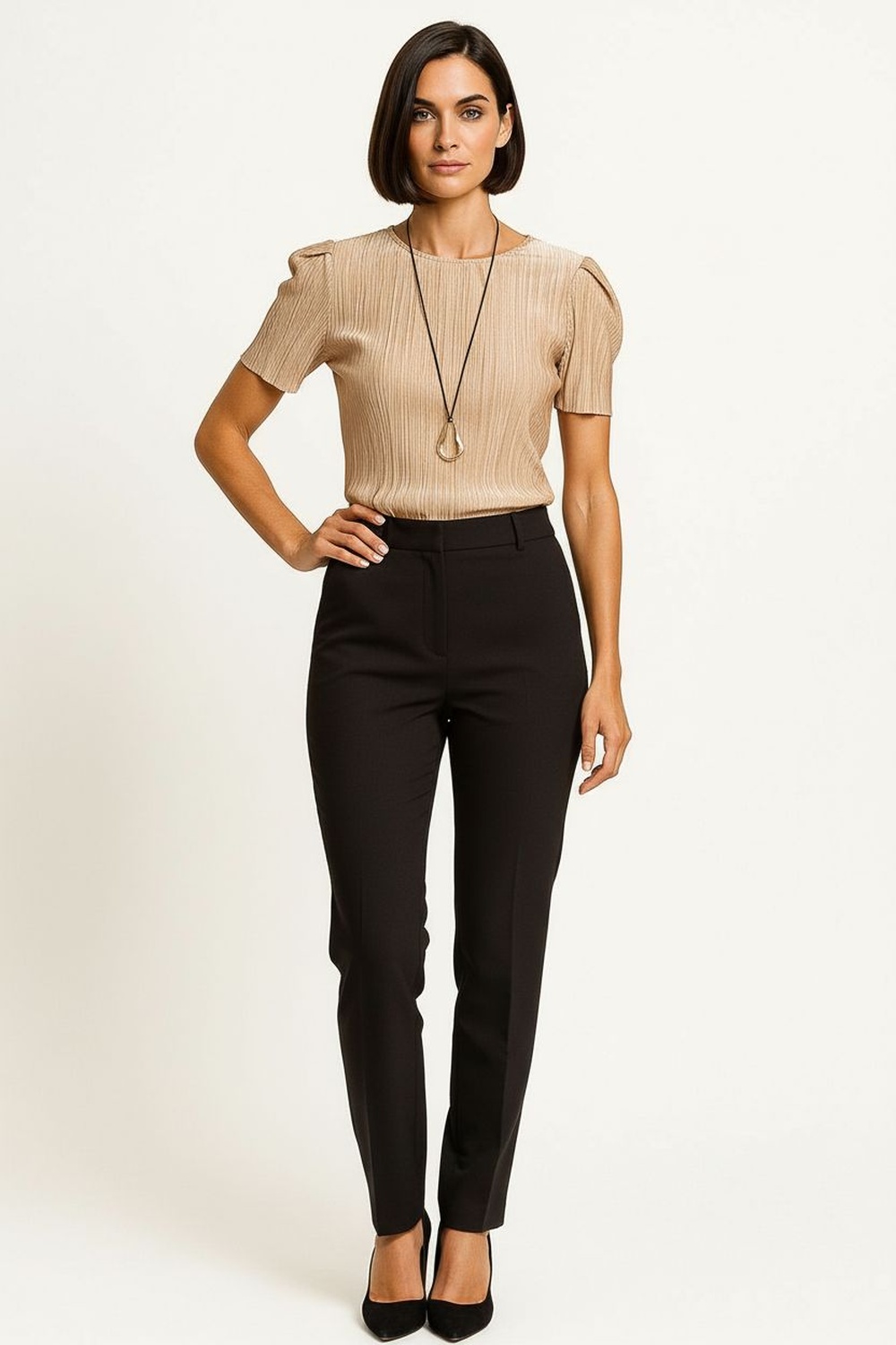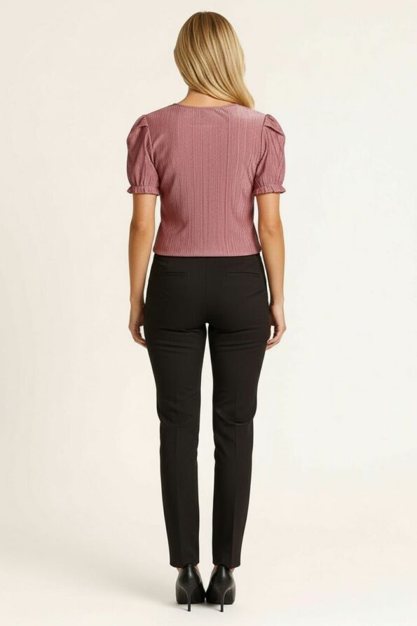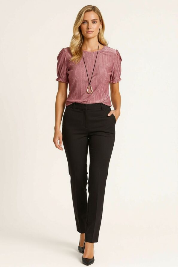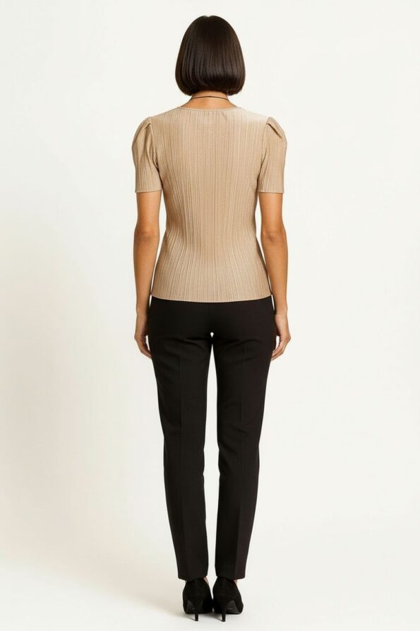 Blusa de manga corta confeccionada en tela ligera de caída fluida que brinda frescura y comodidad, cuello redondo clásico que enmarca de manera sutil el escote, incluye collar decorativo removible que añade un detalle distintivo y versátil, dobladillo con acabado ondulado que aporta movimiento y estilo moderno, corte recto que favorece diferentes siluetas y asegura practicidad en el uso diario