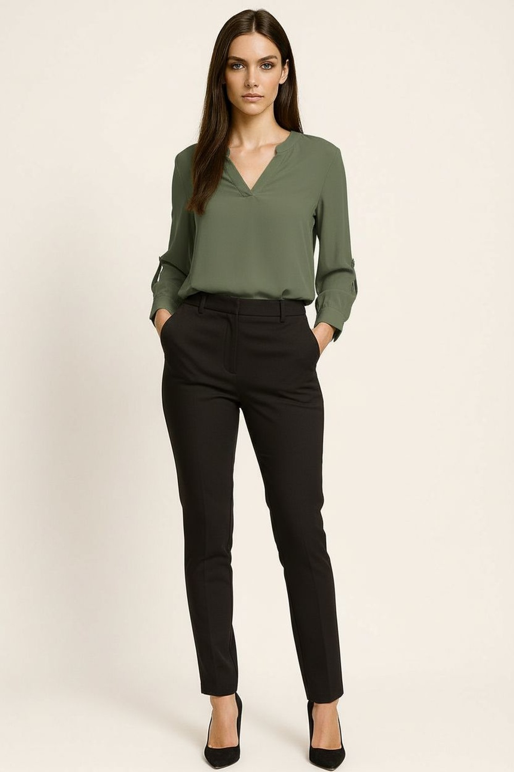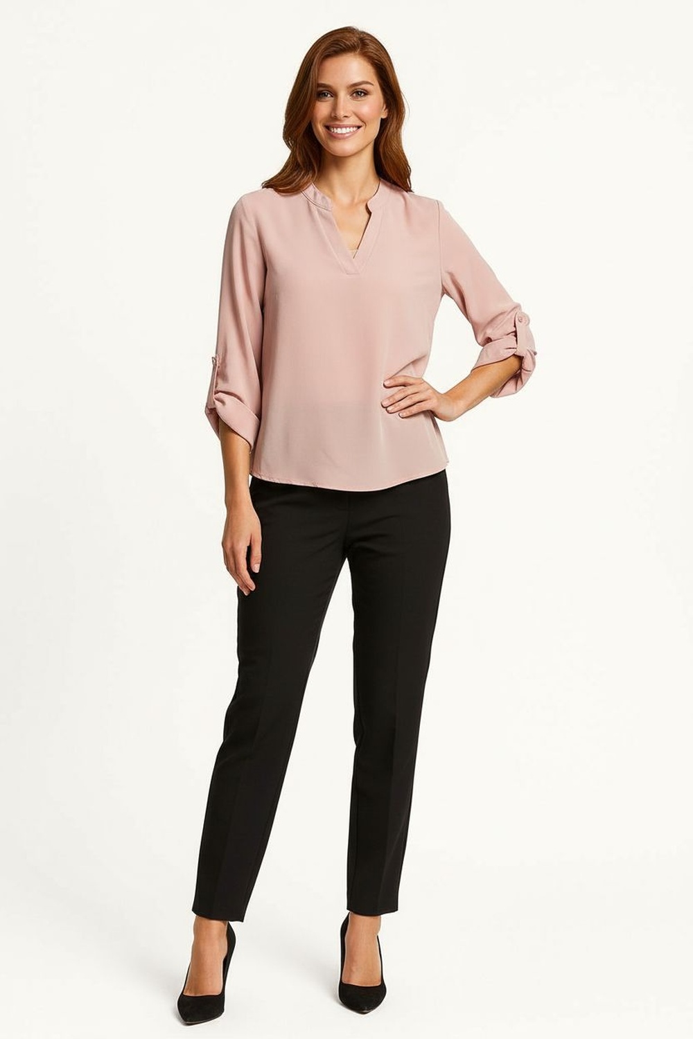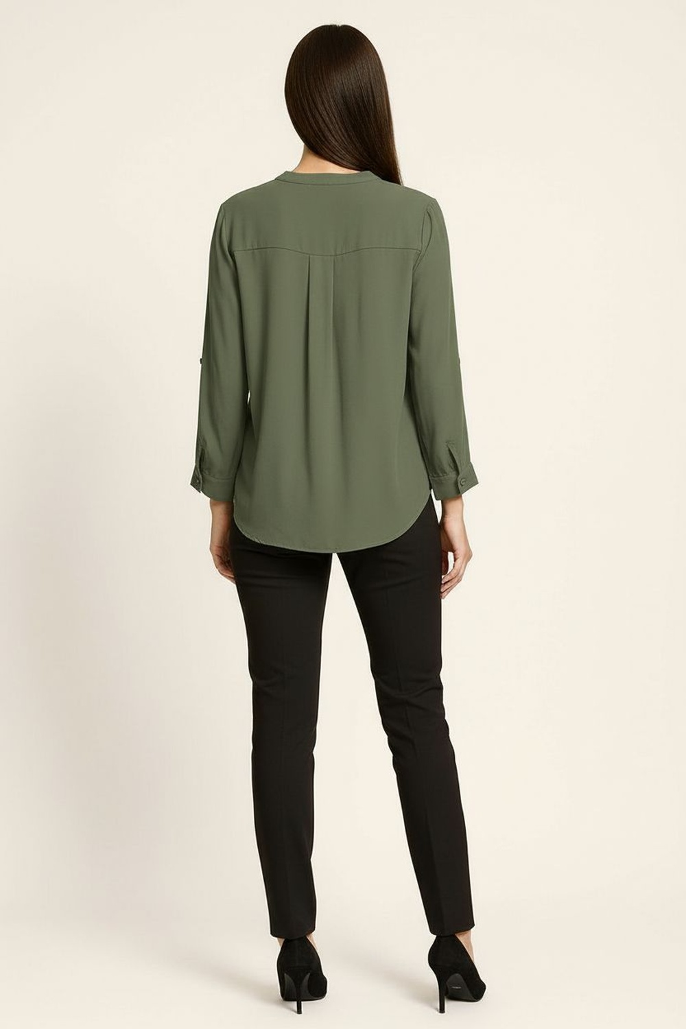 Blusa ligera con cuello mao y escote en “V” que estiliza el cuello, mangas largas con opción de doblado sujetas por presilla y botón, caída fluida que favorece la silueta sin ajustar, terminación curva en el bajo que aporta movimiento y versatilidad