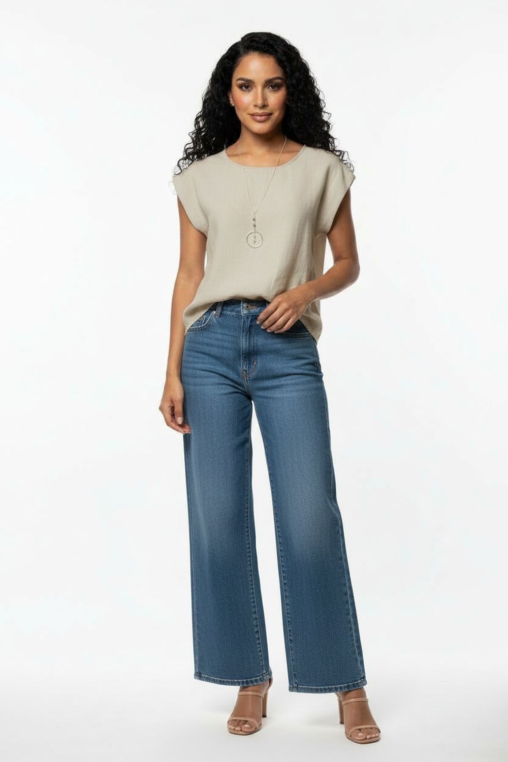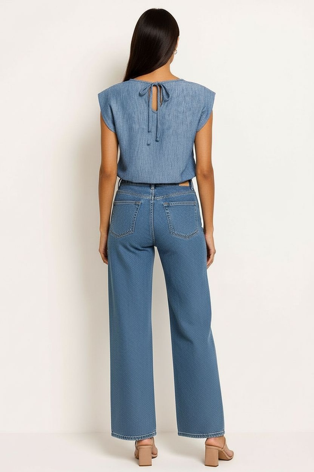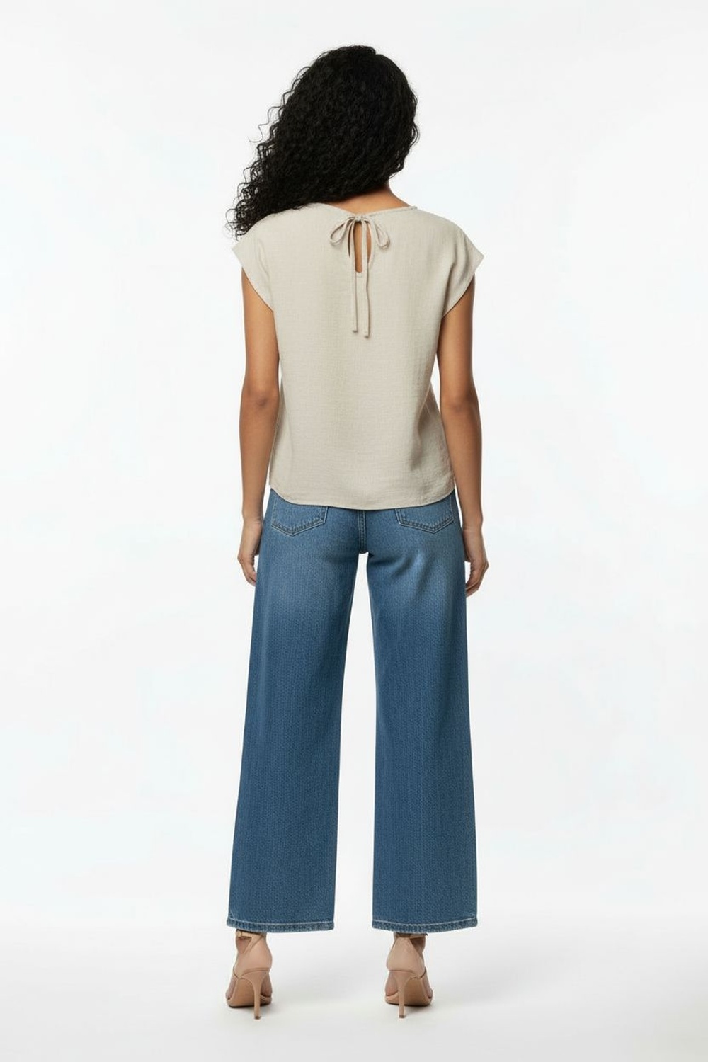 Blusa sin mangas con escote redondo de línea limpia que aporta versatilidad, hombros con ligero vuelo que generan volumen sutil, botonadura posterior funcional que facilita la colocación, corte recto con largo a cadera que ofrece ajuste cómodo, confección en tejido ligero de tacto suave ideal para uso continuo