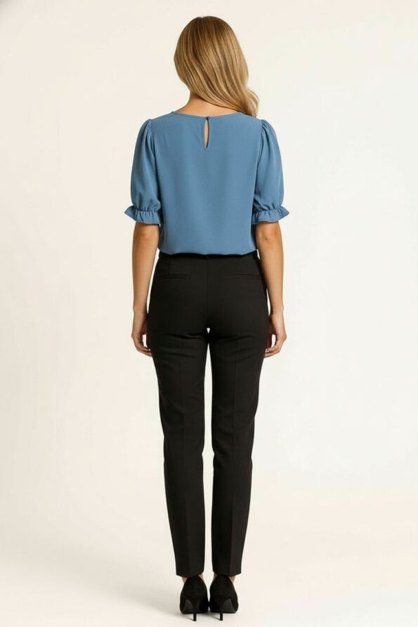 Blusa con alforzas decorativas en los hombros que aportan textura y elegancia, escote redondo con acabado limpio que realza el cuello, mangas cortas con ligero volumen y elástico en el dobladillo que define la forma, cierre posterior con botón que facilita el ajuste, confeccionada en tejido suave con caída natural que proporciona comodidad durante el día