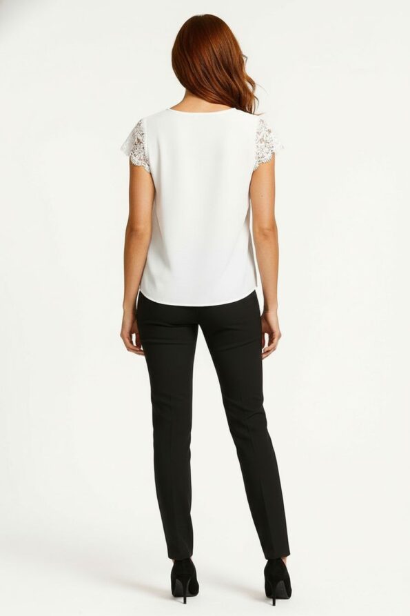 Blusa con manga corta de encaje que aporta un acabado delicado y femenino, escote redondo con terminación limpia que realza el cuello, pinzas verticales al frente que estructuran la silueta, caída recta que proporciona comodidad y libertad de movimiento, confeccionada en tejido ligero de tacto suave que garantiza frescura durante el día