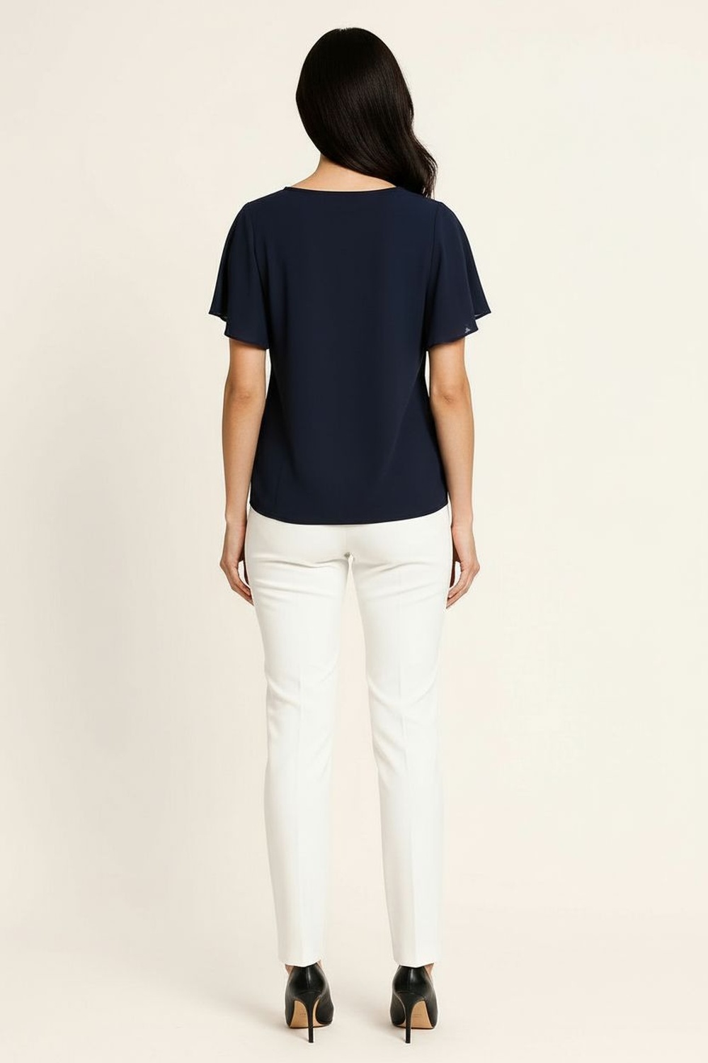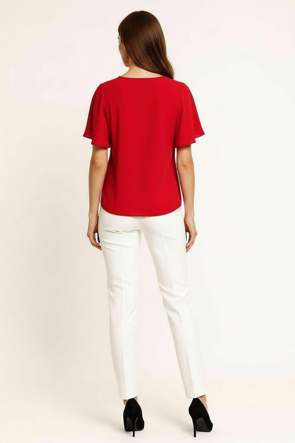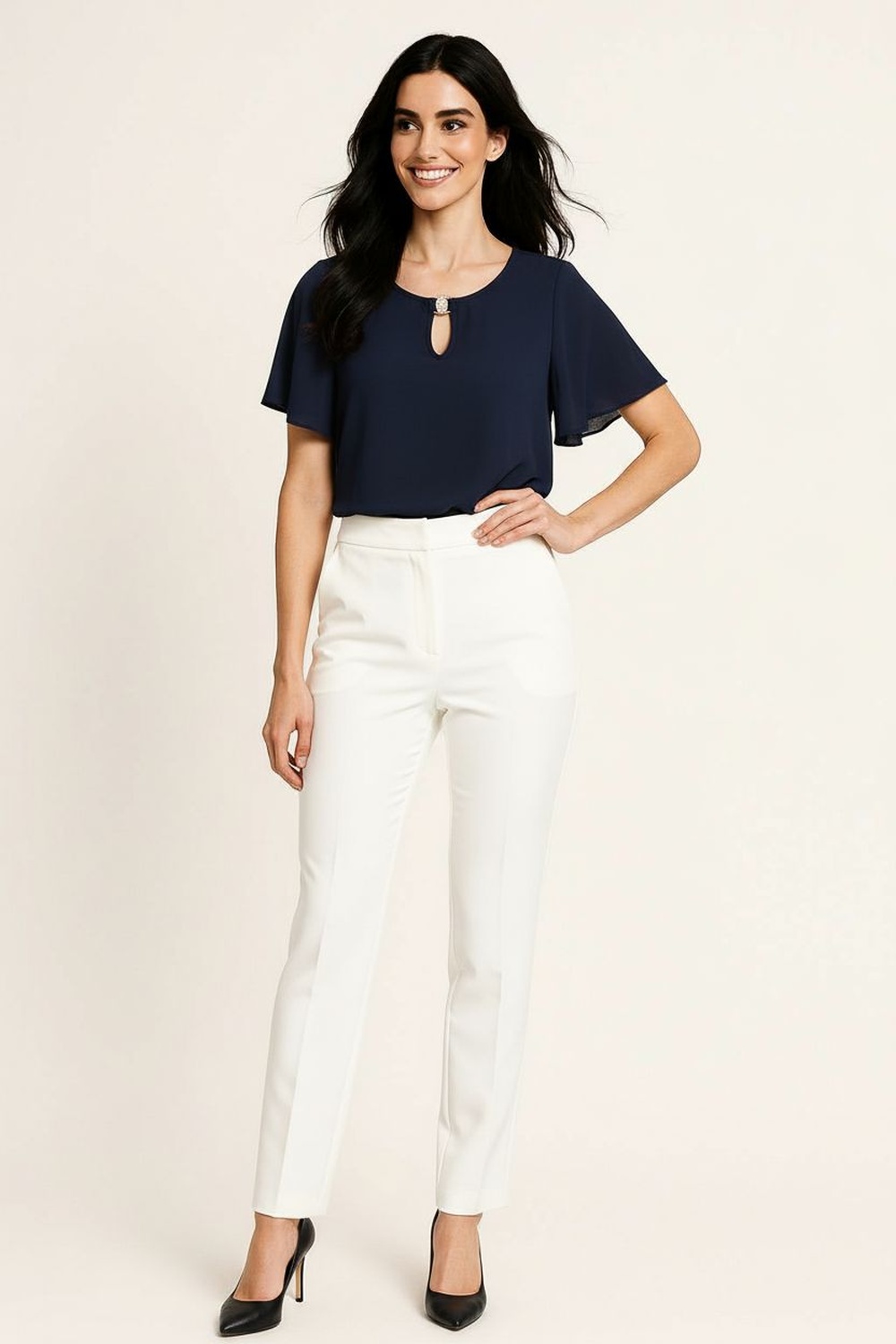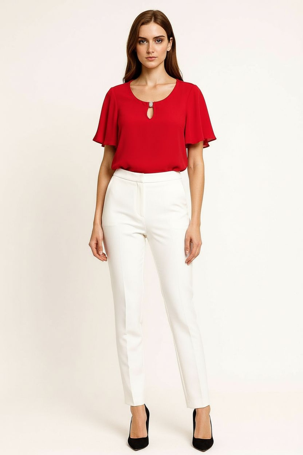 Blusa de manga corta amplia que aporta frescura y comodidad, cuello redondo con abertura en forma de lágrima decorada con herraje metálico que añade un detalle sofisticado, confección en tela ligera que asegura libertad de movimiento, prenda versátil ideal para outfits casuales o combinaciones elegantes de temporada