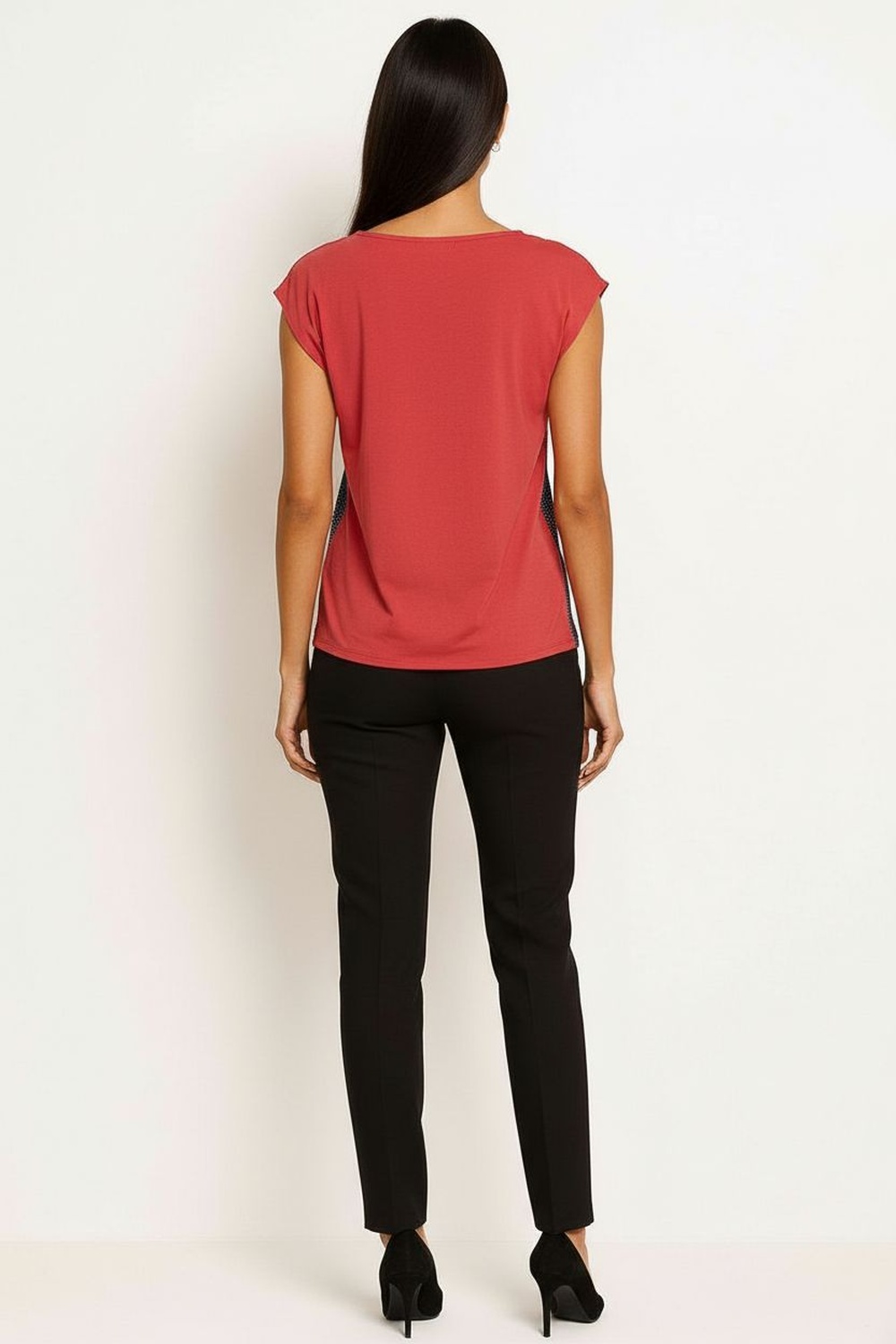 Blusa ligera con corte recto y caída fluida, cuello redondo con terminación limpia, diseño con paneles frontales que aportan dimensión visual, manga corta con caída natural y tejido suave que ofrece comodidad durante todo el día
