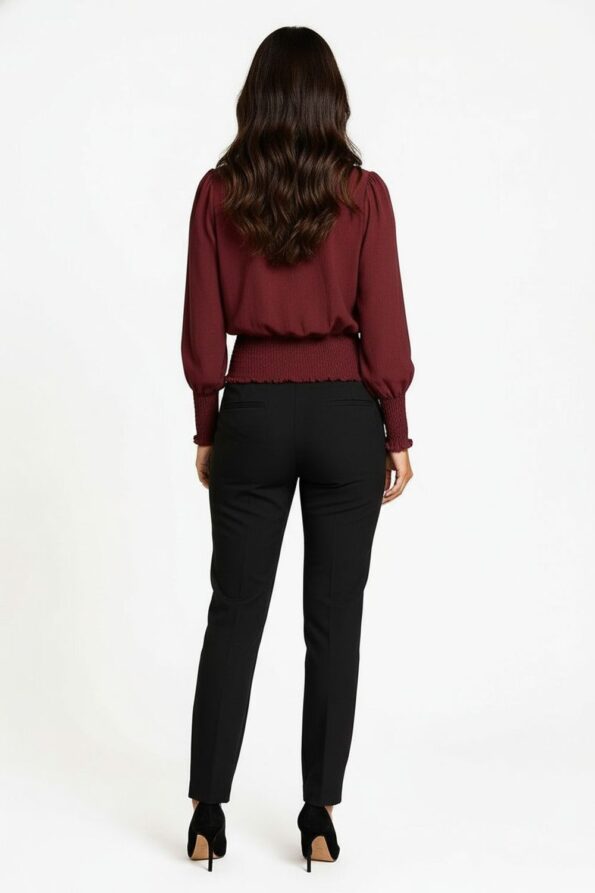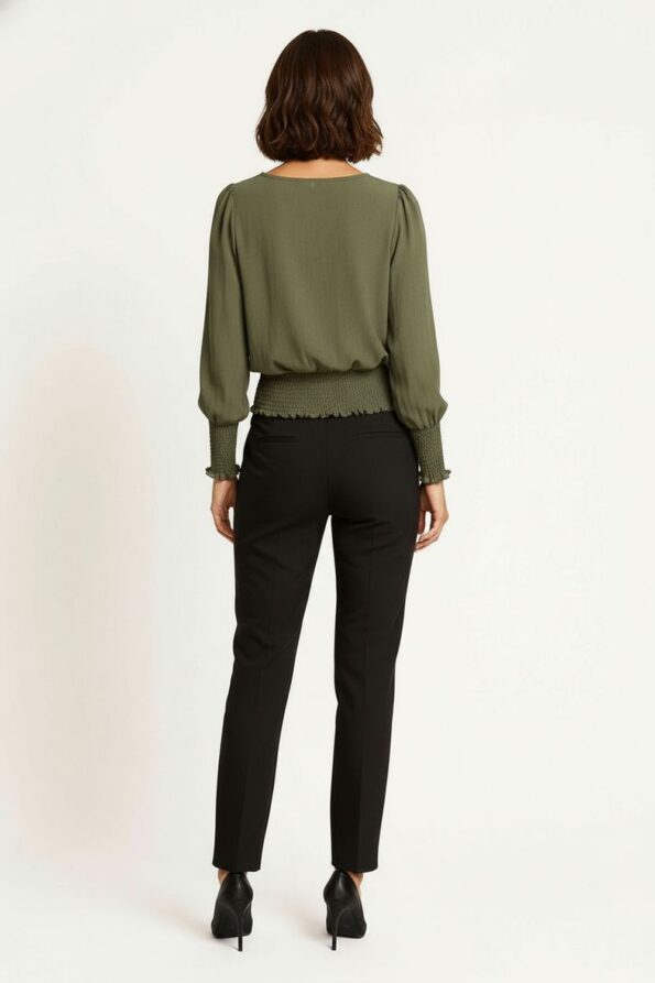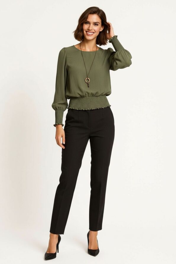 Blusa ligera con cuello redondo adornado con aplicaciones metálicas que aportan un toque distintivo, manga larga con terminación elástica que genera un efecto de volumen sutil, pretina con fruncido que define la cintura y realza la silueta, confección en tejido vaporoso que proporciona comodidad y un movimiento elegante al caminar