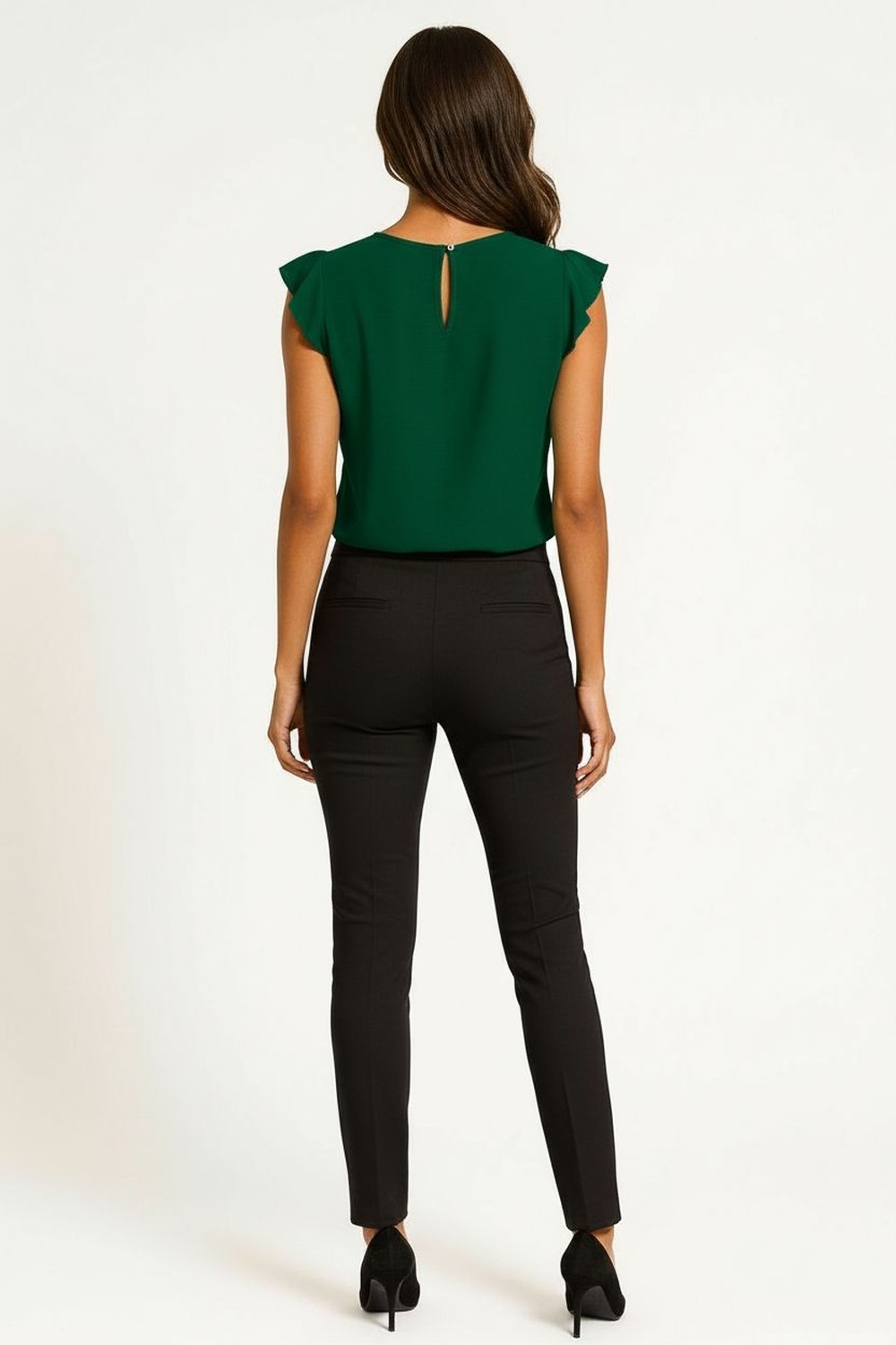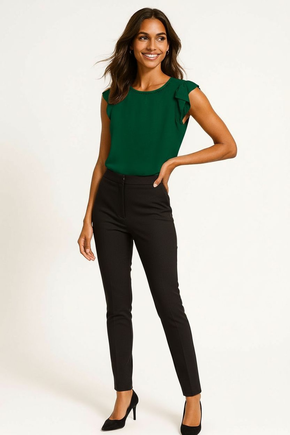 Blusa de manga corta con ligero frunce en hombros que aporta volumen discreto, aplicación decorativa en cuello redondo que realza el diseño, abertura posterior con botón que facilita el ajuste y brinda un acabado femenino, confección en tela ligera con caída natural que aporta frescura y comodidad, ideal para looks de oficina o combinaciones casuales elegantes