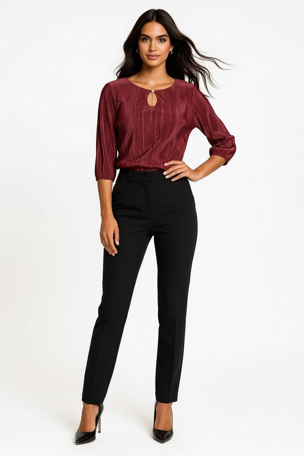 Blusa con escote en forma de V decorado con herraje metálico que aporta un detalle moderno y refinado, manga tres cuartos que brinda equilibrio visual y comodidad, caída fluida que favorece la silueta con acabado estructurado para una apariencia pulida, cierre discreto en la parte posterior que garantiza un ajuste firme y funcional