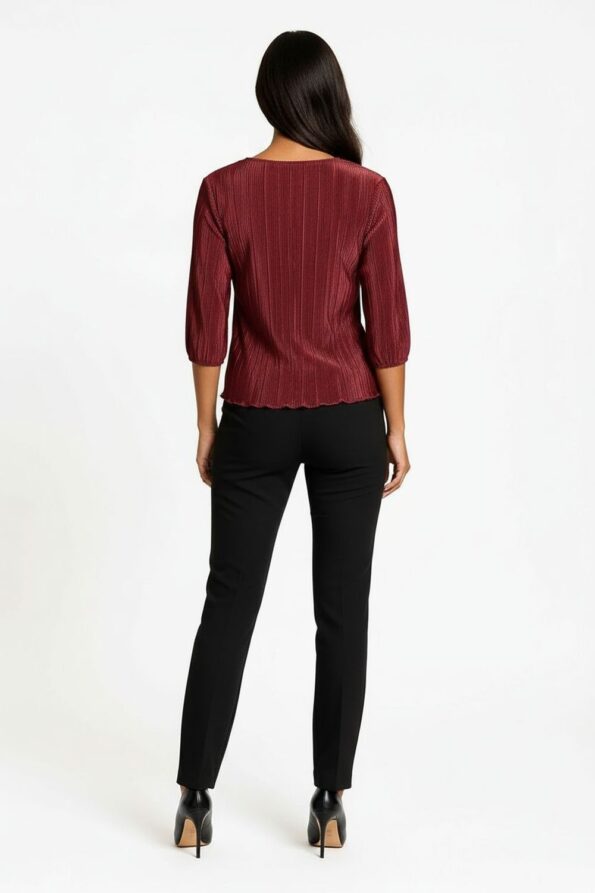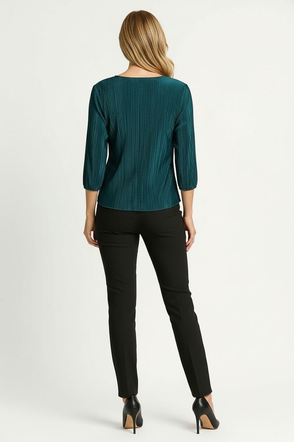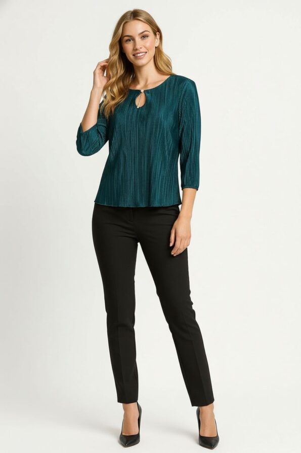 Blusa con textura plisada que aporta elegancia y ligereza, escote redondo con abertura en forma de gota decorada con aplicación metálica que realza el diseño, mangas tres cuartos con caída suave que ofrecen confort y movimiento, confección en tejido fluido que se adapta al cuerpo manteniendo su forma y frescura durante el uso
