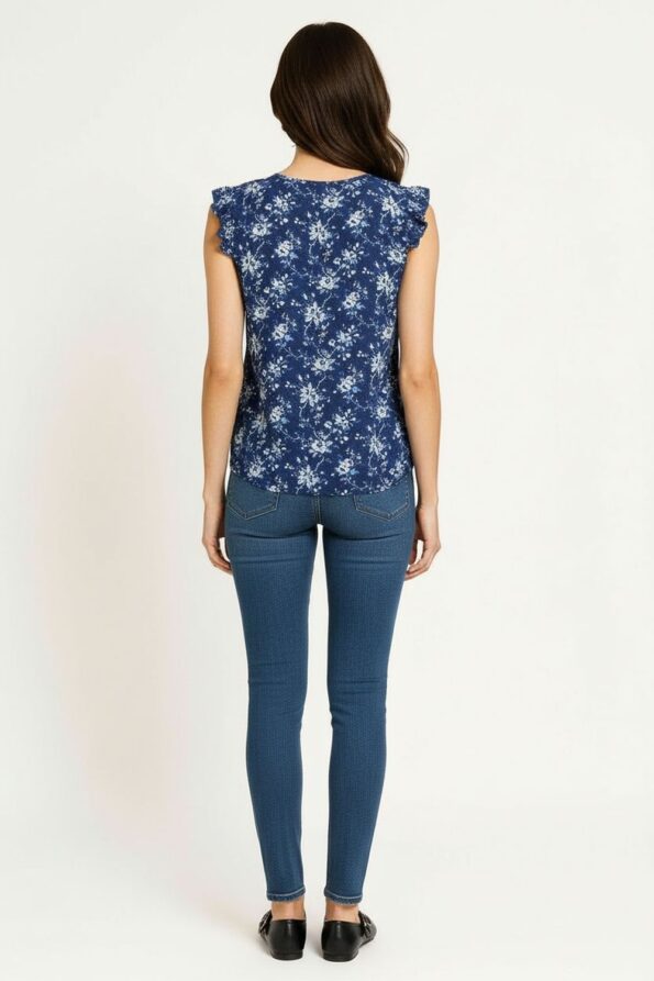 Blusa sin mangas con aplicaciones decorativas en los hombros que aportan un toque delicado, escote redondo con pequeña abertura frontal que añade un detalle moderno, corte recto que brinda comodidad y caída natural, confeccionada en tejido ligero de tacto suave que proporciona frescura durante el día